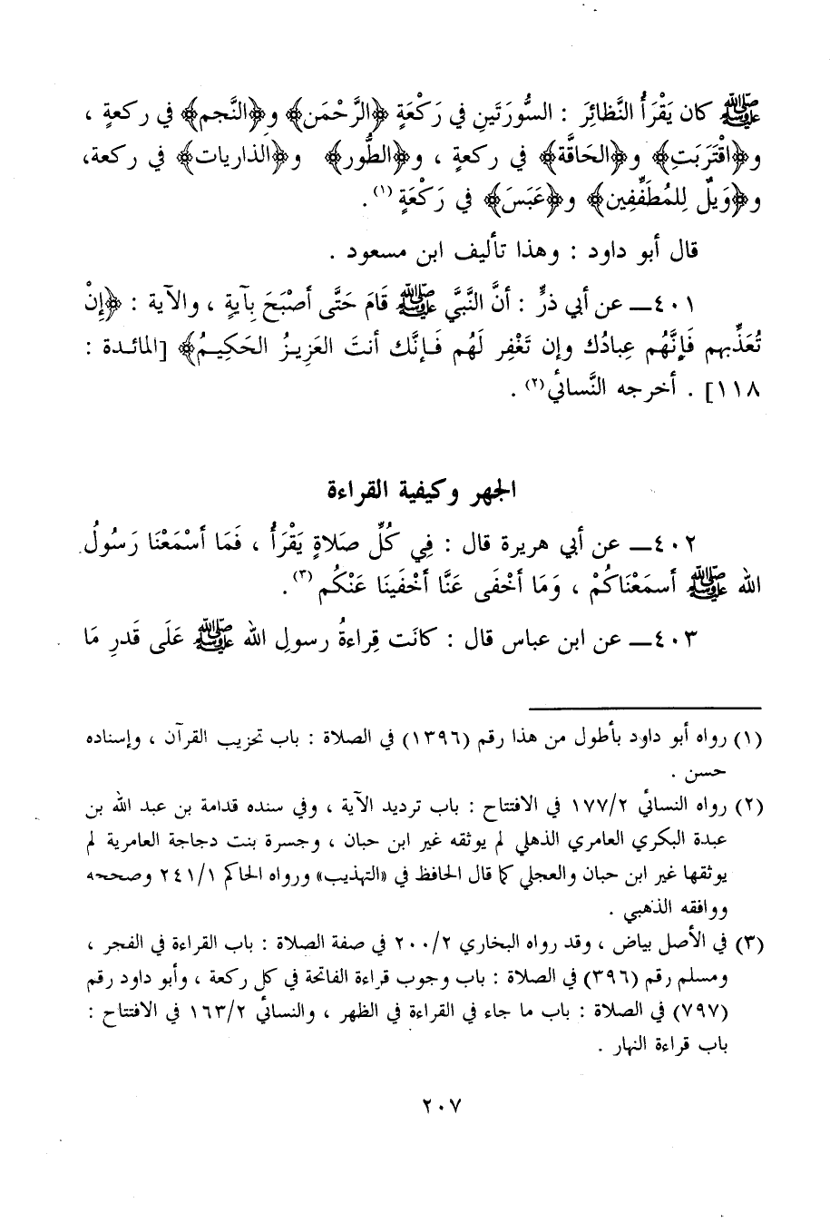 402 - عن أبي هريرة قال: فِي كُلِّ صَلاةٍ يَقْرَأُ، فَمَا أَسْمَعَنَا رَسُولُ الله - صلى الله عليه وسلم - أسمَعْنَاكُمْ، وَمَا أخْفَى عَنَّا أخْفَينَا عَنْكُم (¬3).