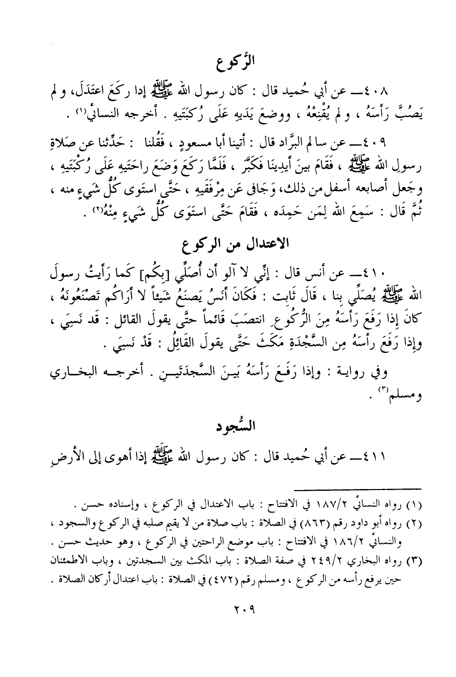 408 - عن أبي حُميد قال: كان رسول الله - صلى الله عليه وسلم - إذا ركَعَ اعتَدَلَ، ولم يَصُبَّ رَأسَهُ، ولم يُقْنِعْهُ، ووضعَ يَدَيهِ عَلَى رُكبَتَيهِ. أخرجه النسائي (¬1).