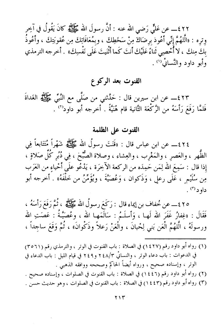 424 - عن ابن عباس قال: "قَنَتَ رسولُ الله - صلى الله عليه وسلم - شَهْرًا مُتَتَابعًا فِي الظُّهر، والعَصرِ، والمَغْرِب، والعِشاء، وصلاة الصُّبْح، فِي دُبُرِ كُلِّ صَلاةٍ، إِذا قال: سَمِعَ الله لِمَن حَمِدَه من الركعة الآخِرَة، يَدْعُو علَى أَحْياءٍ من العَرَب مِن سُلَيْمٍ، عَلَى رعلٍ، وَذَكوان، وَعُصَيَّةَ، ويُؤَمِّنُ من خَلْفَهُ". أخرجه أبو داود (¬3).
