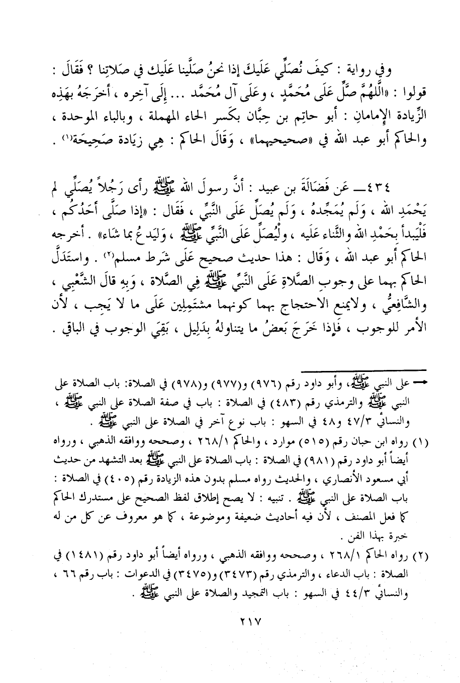 (¬1) رواه ابن حبان رقم (515) موارد، والحاكم 1/ 268، وصححه ووافقه الذهبي، ورواه أيضًا أبو داود رقم (981) في الصلاة: باب الصلاة على النبي - صلى الله عليه وسلم - بعد التشهد من حديث أبي مسعود الأنصاري، والحديث رواه مسلم بدون هذه الزيادة رقم (405) في الصلاة: باب الصلاة على النبي - صلى الله عليه وسلم -. تنبيه: لا يصح إطلاق لفظ الصحيح على مستدرك الحاكم كما فعل المصنف، لأن فيه أحاديث ضعيفة وموضوعة، كما هو معروف عن كل من له خبرة بهذا الفن.