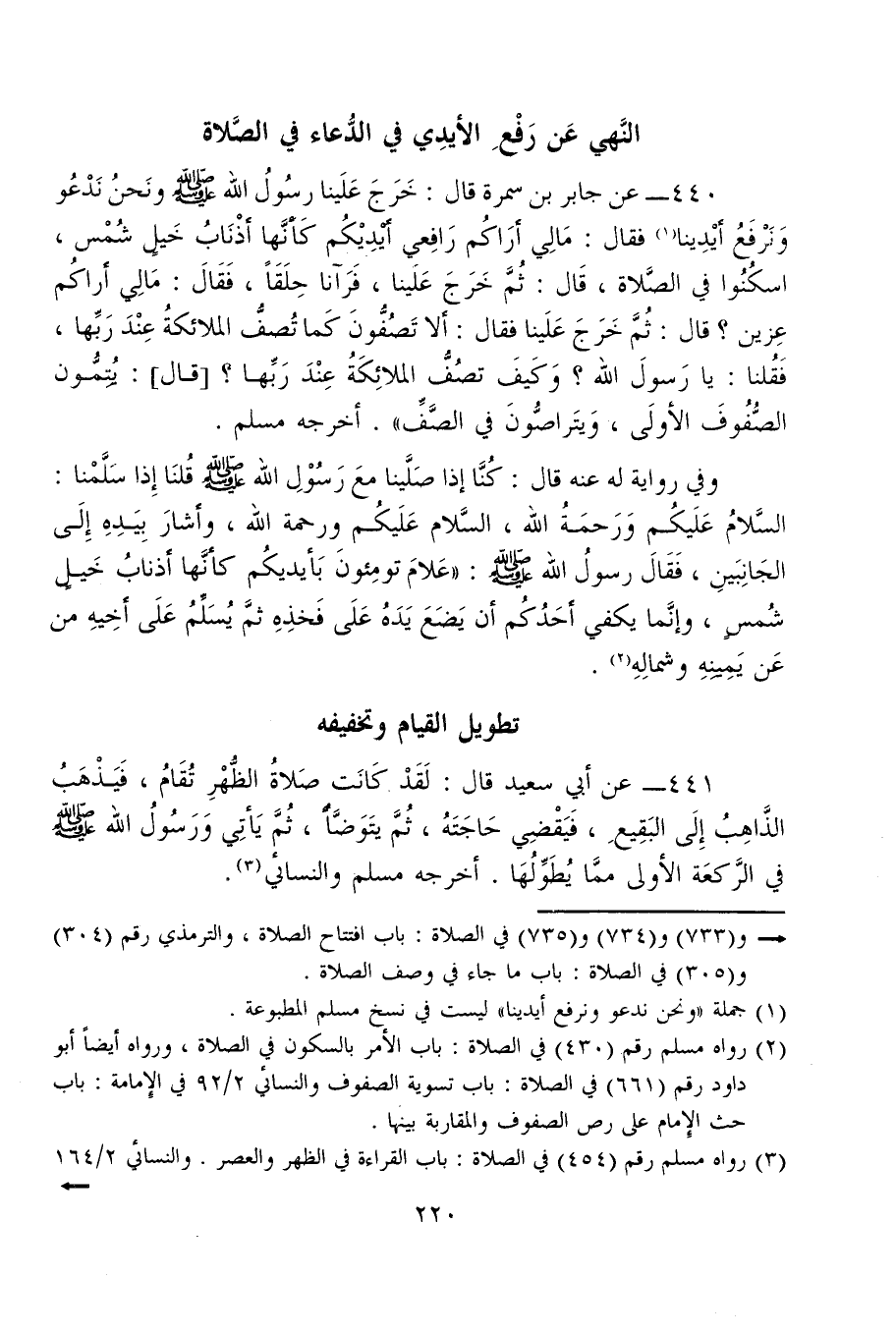 440 - عن جابر بن سمرة قال: خَرَجَ عَلَينا رسُولُ الله - صلى الله عليه وسلم - ونَحن نَدْعُو وَنَرْفَعُ أَيْدِينا (¬1) فقال: مَالِي أرَاكُم رَافِعي أَيْدِيْكُم كَأَنَّها أذْنَابُ خَيلٍ شُمْس، اسكُنُوا في الصَّلاة، قَال: ثُمَّ خَرَجَ عَلَينا، فَرَآنا حِلَقًا، فَقَالَ: مَالِي أراكُم عِزين؟ قال: ثُمَّ خَرَجَ عَلَينا فقال: ألا تَصُفُّونَ كَما تُصفُّ الملائكةُ عِنْدَ رَبِّها، فَقُلنا: يا رَسولَ الله؟ وَكَيفَ تصُفُّ الملائِكَةُ عِنْدَ رَبِّها؟ [قال]: يُتِمُّون الصُّفُوفَ الأولَى، وَيتَراصُّون في الصَّفِّ". أخرجه مسلم.