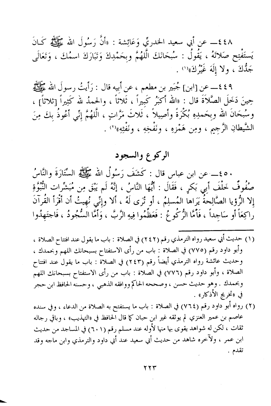 449 - عن [ابن] جُبَير بن مطعم، عن أَبِيه قال: رَأَيتُ رسولَ الله - صلى الله عليه وسلم - حِين دَخَلَ الصَّلَاةَ قال: "الله أكبَرُ كَبِيرًا، ثَلاثًا، والحمدُ لله كَثِيرًا [ثلاثًا]، وسُبحَانَ الله وبِحَمدِهِ بُكْرَةً وأصِيلًا، ثَلاثَ مَرَّاتٍ، اللَّهُمَّ إِنِّي أعُوذُ بِكَ مِنَ الشَّيطانِ الرَّجِيم، ومِنْ هَمْزهِ، ونَفْخِهِ، ونَفْثِهِ" (¬2).