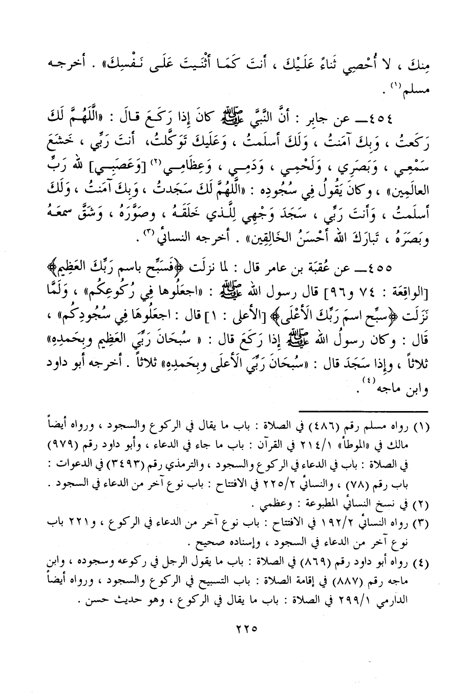 455 - عن عُقبَة بن عامر قال: لما نزلَت {فَسَبِّحْ بِاسْمِ رَبِّكَ الْعَظِيمِ} [الواقعة: 74 و 96] قال رسول الله - صلى الله عليه وسلم -: "اجعَلُوها فِي رُكُوعِكُم"، وَلَمَّا نَزَلَت {سَبِّحِ اسْمَ رَبِّكَ الْأَعْلَى} [الأعلى: 1] قال: اجعَلُوهَا فِي سُجُودِكُم"، قَال: وكان رسولُ الله - صلى الله عليه وسلم - إِذا رَكَعَ قال: "سُبحَانَ رَبِّيَ العَظِيم وبِحَمدِهِ" ثلاثًا، وإِذا سَجَدَ قال: "سُبحَانَ رَبِّيَ الَأعلَى وبحَمدِهِ" ثلاثًا. أخرجه أبو داود وابن ماجه (¬4).