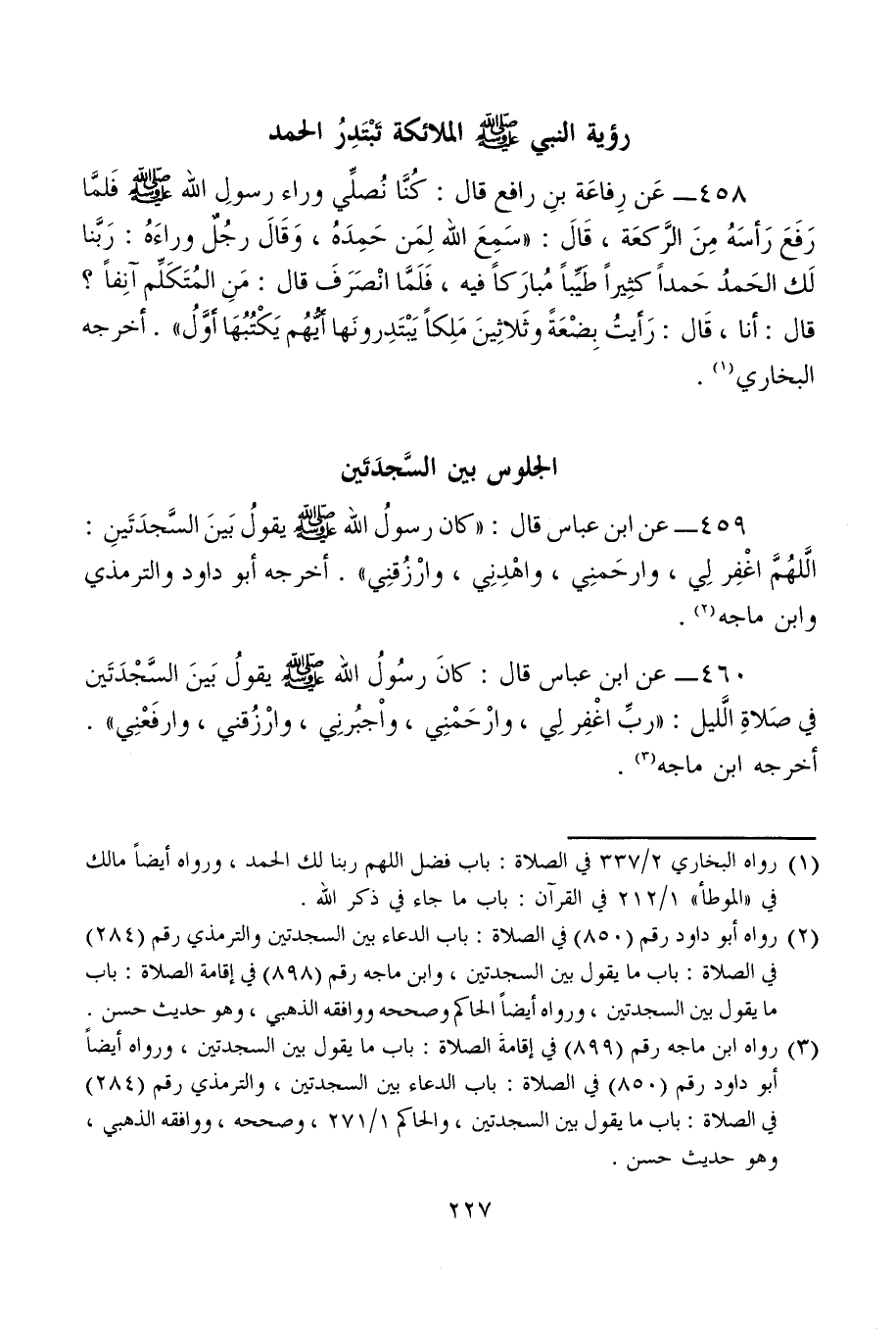(¬2) رواه أبو داود رقم (850) في الصلاة: باب الدعاء بين السجدتين والترمذي رقم (284) في الصلاة: باب ما يقول بين السجدتين، وابن ماجه رقم (898) في إقامة الصلاة: باب ما يقول بين السجدتين، ورواه أيضًا الحاكم وصححه ووافقه الذهبي، وهو حديث حسن.