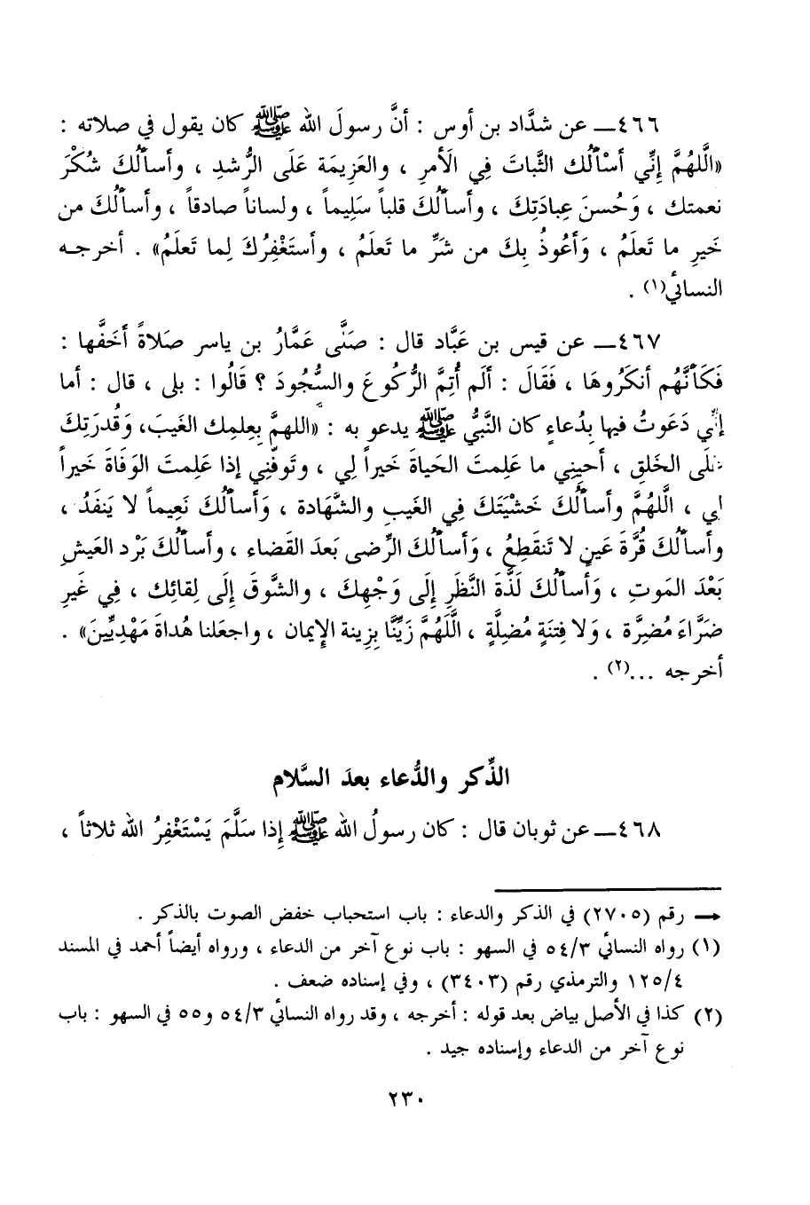 466 - عن شدَّاد بن أوس: أنَّ رسولَ الله - صلى الله عليه وسلم - كان يقول في صلاته: "الَّلهُمَّ إِنِّي أسْألُكَ الثَّباتَ فِي الأَمْرِ، والعَزِيمَة عَلَى الرُّشدِ، وأَسْأَلُكَ شُكْرَ نعمتك، وَحُسنَ عِبادَتِكَ، وأسْأَلُكَ قلبًا سَلِيمًا، ولسانًا صادقًا، وأَسْأَلُكَ من خَيرِ ما تَعلَمُ، وَأعُوذُ بِكَ من شَرِّ ما تَعلَمُ، وأَسْتَغْفِرُكَ لِما تَعلَمُ". أخرجه النسائي (¬1).