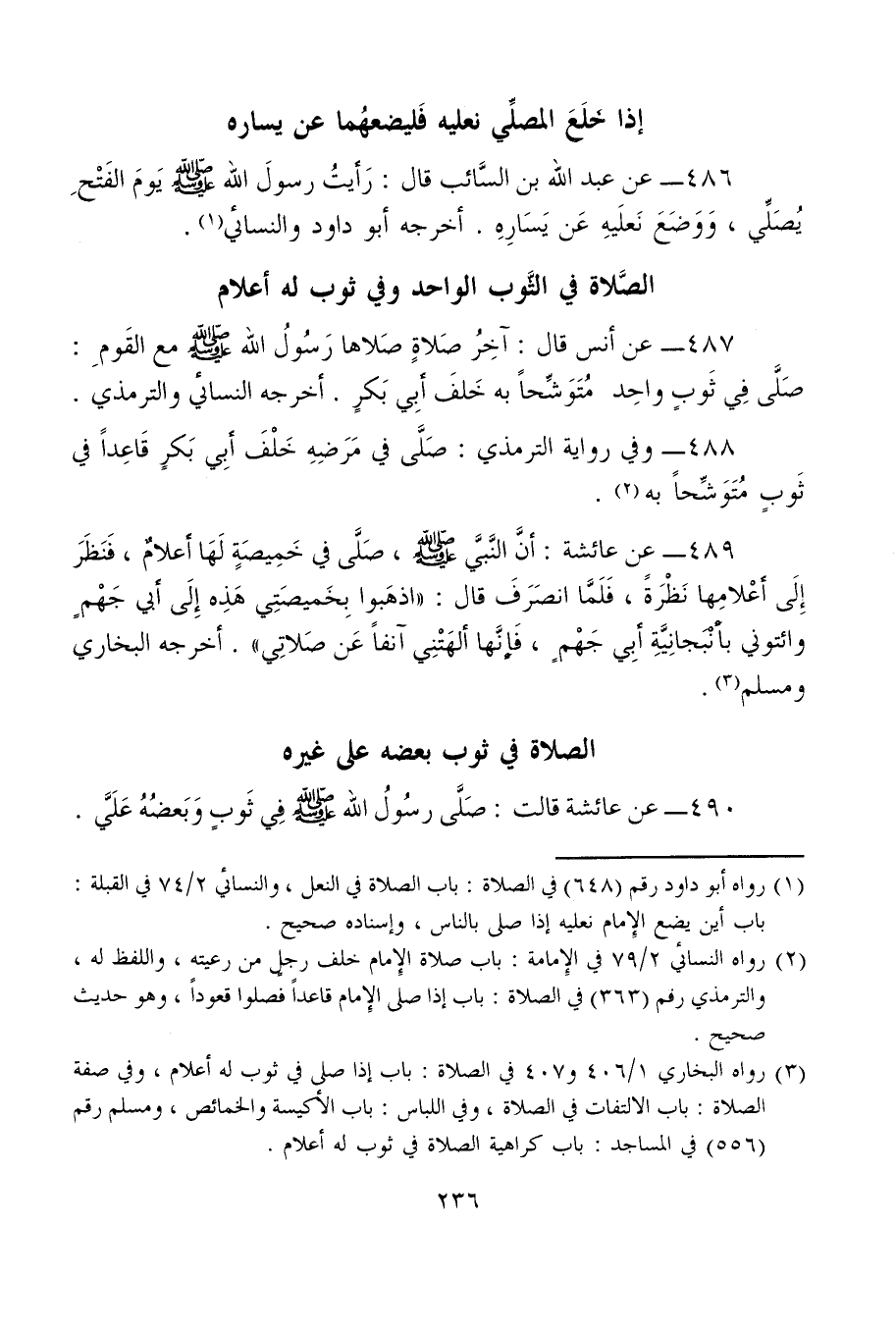 486 - عن عبد الله بن السَّائب قال: رَأيتُ رسولَ الله - صلى الله عليه وسلم - يَومَ الفَتْحِ يُصَلِّي، وَوَضَعَ نَعلَيهِ عَن يَسَارِهِ. أخرجه أبو داود والنسائي (¬1).