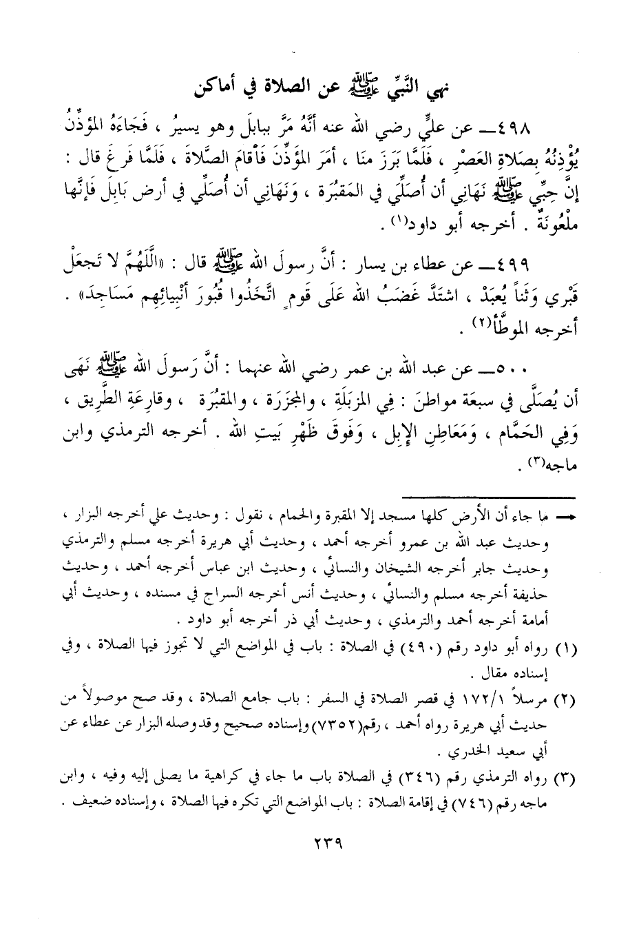 498 - عن عليٍّ رضي الله عنه أنَّهُ مَرَّ ببابلَ وهو يسيرُ، فَجَاءَهُ المؤذِّنُ يُؤْذِنُهُ بِصَلاةِ العَصْرِ، فَلَمَّا بَرَزَ منَا، أمَرَ المؤَذِّنَ فَأقامَ الصَّلاةَ، فَلَمَّا فَرغَ قال: إنَّ حِبِّي - صلى الله عليه وسلم - نَهَانِي أن أُصَلِّيَ في المَقبرَة، وَنَهَانِي أن أُصَلِّي في أرض بَابِلَ فَإنَّها ملْعُونَةٌ. أخرجه أبو داود (¬1).