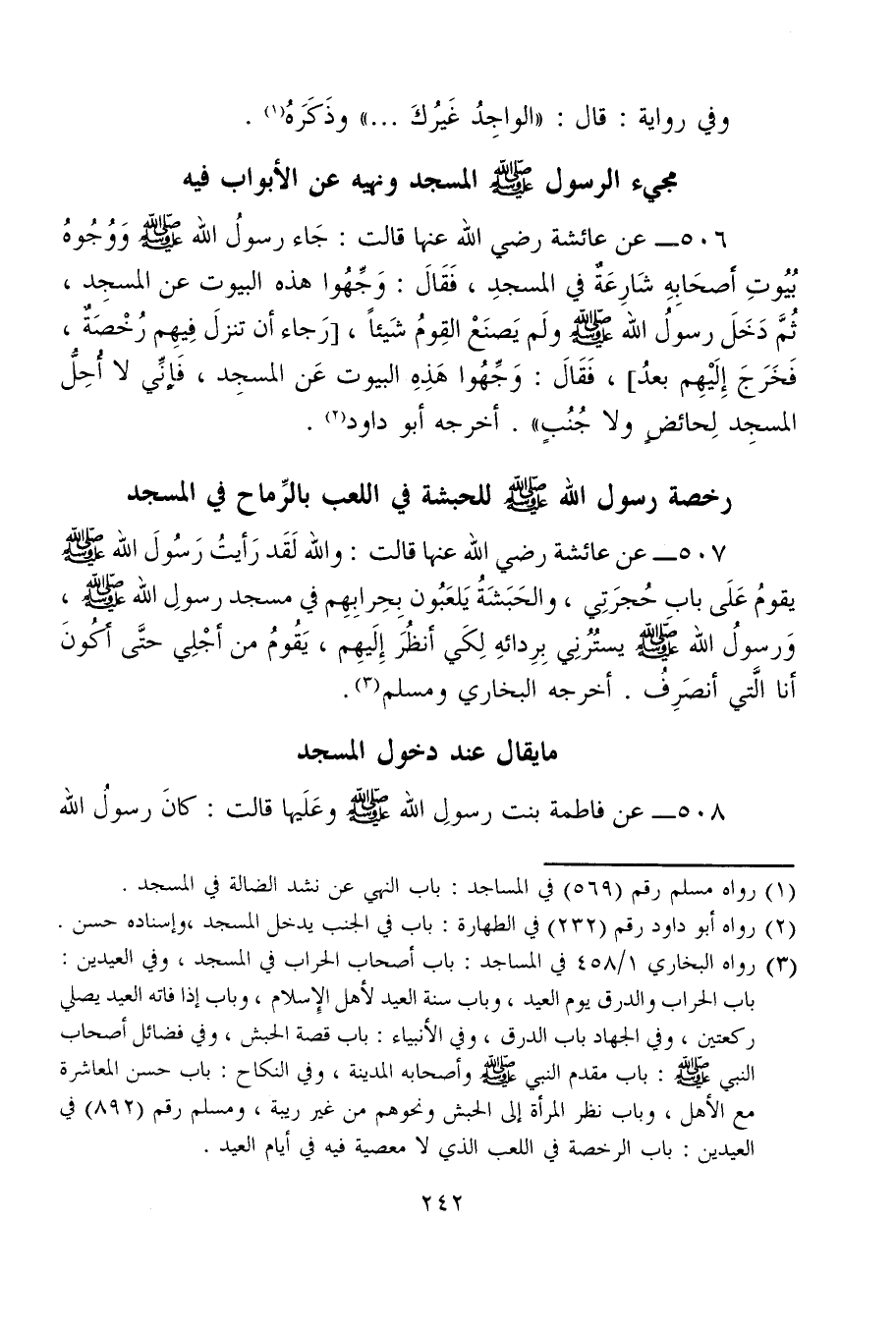 506 - عن عائشة رضي الله عنها قالت: جَاء رسولُ الله - صلى الله عليه وسلم - وَوُجُوهُ بُيُوتِ أصحَابِهِ شَارِعَةٌ في المسجدِ، فَقَالَ: وَجِّهُوا هذه البيوت عن المسجِد، ثُمَّ دَخَلَ رسولُ الله - صلى الله عليه وسلم - ولَم يَصنَعْ القَومُ شَيئًا، [رَجاء أن تنزلَ فِيهِم رُخْصَةٌ، فَخَرَجَ إِلَيْهِم بعدُ]، فَقَالَ: وَجِّهُوا هَذِهِ البيوت عَن المسجِد، فإنِّي لا أُحِلُّ المسجِد لِحائضٍ ولا جُنُبٍ". أخرجه أبو داود (¬2).