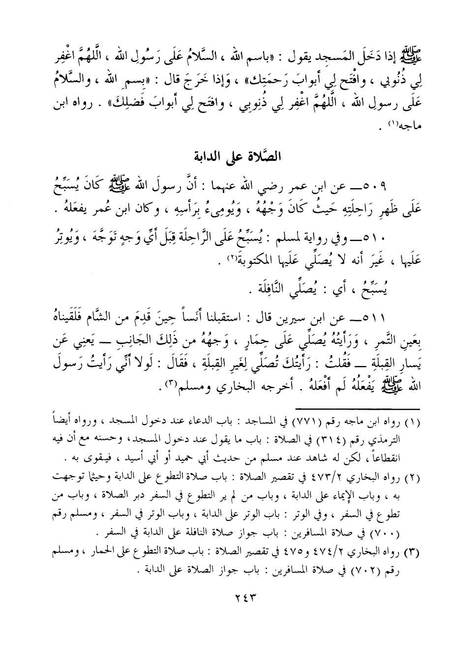 (¬3) رواه البخاري 2/ 474 و 475 في تقصير الصلاة: باب صلاة التطوع على الحمار، ومسلم رقم (702) في صلاة المسافرين: باب جواز الصلاة على الدابة.