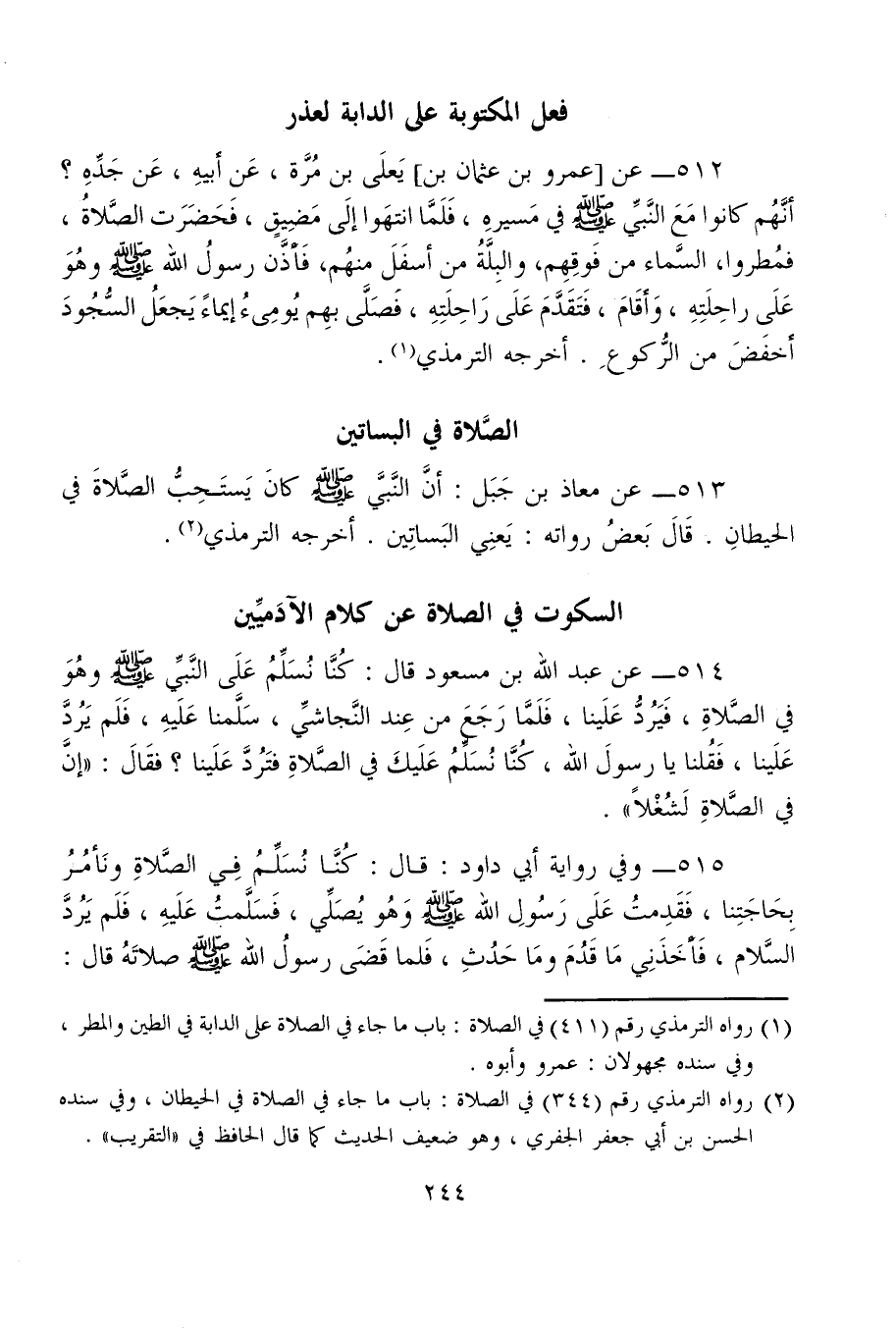 515 - وفي رواية أبي داود: قال: كُنَّا نُسلِّمُ فِي الصَّلاةِ ونَأمُرُ بِحَاجَتِنا، فَقَدِمتُ عَلَى رَسُولِ الله - صلى الله عليه وسلم - وَهُو يُصَلِّي، فَسَلَّمتُ عَلَيهِ، فَلَم يَرُدَّ السَّلام، فأخَذَنِي مَا قَدُمَ ومَا حَدُثَ، فَلما قَضَى رسولُ الله - صلى الله عليه وسلم - صلاتَهُ قال: