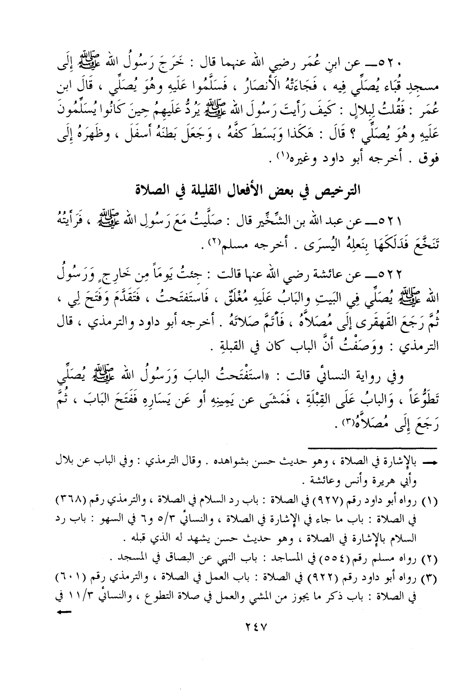 520 - عن ابنِ عُمَر رضِي الله عنهما قال: خَرَج رَسُولُ الله - صلى الله عليه وسلم - إِلَى مسجِدِ قُبَاء يُصَلِّي فِيه، فَجَاءَتْهُ الأنصَارُ، فَسَلَّمُوا عَلَيهِ وهُوَ يُصَلِّي، قَالَ ابن عُمَر: فَقُلتُ لِبلالٍ: كَيفَ رَأيتَ رَسُولَ الله - صلى الله عليه وسلم - يَرُدُّ عَلَيهِم حين كَانُوا يُسَلِّمُونَ عَلَيهِ وهُوَ يُصَلِّي؟ قَالَ: هَكَذا وَبَسَطَ كفَّهُ، وَجَعَلَ بَطنَهُ أسفَلَ، وظَهرَهُ إِلَى فوق. أخرجه أبو داود وغيره (¬1).