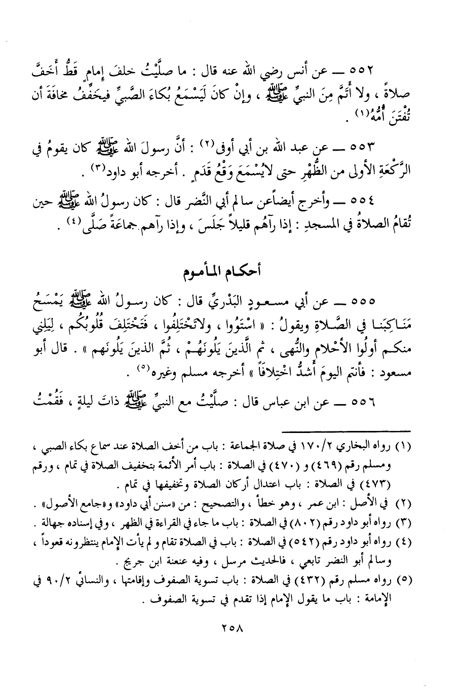 552 - عن أنس رضي الله عنه قال: ما صلَّيْتُ خلفَ إِمامٍ قَطُّ أَخَفَّ صلاةً، ولا أَتَمَّ من النبيِّ - صلى الله عليه وسلم -، وإنْ كانَ لَيَسْمَعُ بُكاءَ الصَّبيِّ فيخَفِّفُ مخافَةَ أن تُفْتَنَ أُمُّهُ (¬1).