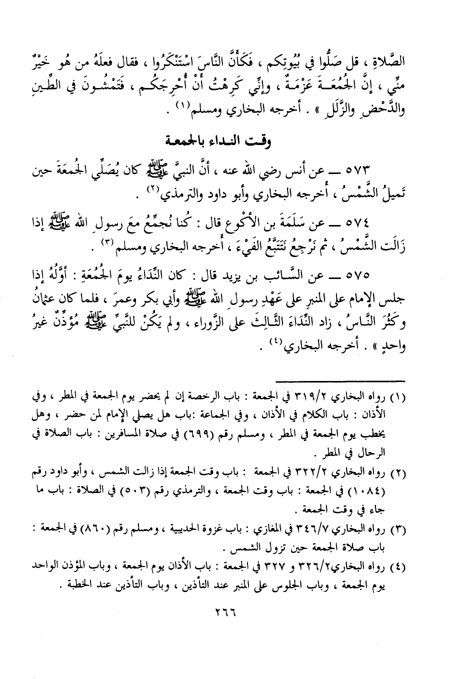 573 - عن أنس رضي الله عنه، أنَّ النبيَّ - صلى الله عليه وسلم - كان يُصَلِّي الجُمعَةَ حين تَميلُ الشَّمْسُ، أَخرجه البخاري وأبو داود والترمذي (¬2).