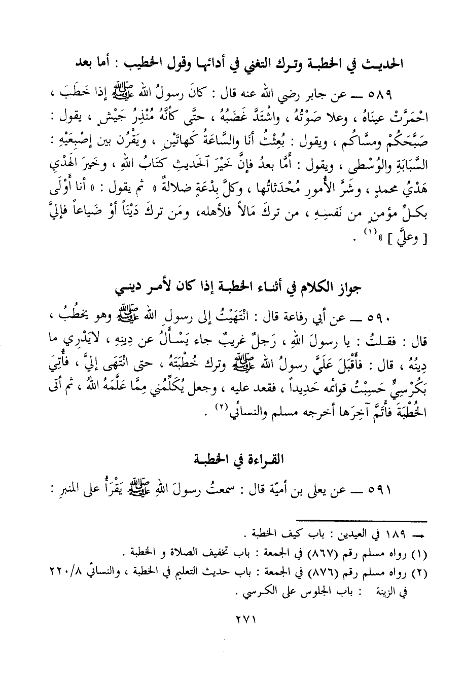 589 - عن جابر رضي الله عنه قال: كانَ رسولُ الله - صلى الله عليه وسلم - إذا خَطَبَ، احْمَرَّتْ عينَاهُ، وعلا صَوْتُهُ، واشْتَدَّ غَضَبُهُ، حتَّى كأنَّهُ مُنْذِرُ جَيْشٍ، يقول: صَبَّحَكُمْ ومسَّاكُم، ويقول: بُعِثْتُ أنا والسَّاعَةُ كَهاتَيْن، ويَقرُن بين إصبِعَيْهِ: السَّبَابَةِ والوُسْطى، ويقول: أَمَّا بعدُ فإنَّ خَيْرَ الحَديثِ كتَابُ اللهِ، وخَيرَ الهَدْيِ هَدْيُ محمدٍ، وشَرَّ الأُمورِ مُحْدَثاتُها، وكلَّ بدْعَةٍ ضلالةٌ" ثم يقول: "أنا أَوْلَى بكلِّ مؤمنٍ من نَفسِهِ، من تركَ مَالًا فلأهله، ومَن تركَ دَيْنًا أو ضَياعًا فإليَّ [وعليَّ] " (¬1).