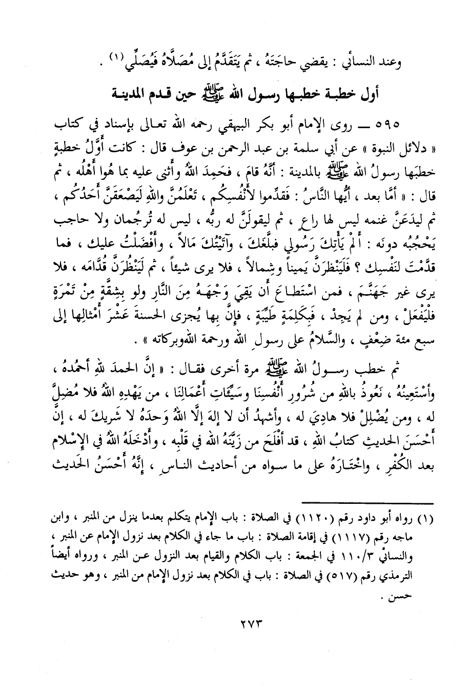 595 - روى الإمام أبو بكر البيهقي رحمه الله تعالى بإسناد في كتاب "دلائل النبوة" عن أبي سلمة بن عبد الرحمن بن عوف قال: كانت أَوَّلُ خطبةٍ خطبَها رسولُ الله - صلى الله عليه وسلم - بالمدينة: أنَّهُ قامَ، فحَمِدَ اللهُ وأَثنى عليه بما هُو أَهْلُه، ثم قال: "أمَّا بعد، أيُّها النَّاسُ: فَقدِّموا لأَنْفُسِكُم، تَعْلَمُنَّ واللهِ لَيَصْعَقَنَّ أَحَدُكُم، ثم ليدَعَنَّ غنمه ليس لها راعٍ، ثم ليقولَنَّ له ربُّه، ليس له تُرجُمان ولا حاجب يَحْجُبُه دونَه: أَلمْ يَأْتِكَ رَسُولي فبلَّغَكَ، وآتَيْتُكَ مَالًا، وأَفْضَلْتُ عليك، فما قدَّمْتَ لنَفْسِك؟ فَلَيَنْظرَنَّ يَمينًا وشِمالًا، فلا يرى شيئًا، ثم لَيَنْظُرَنَّ قُدَّامَه، فلا يرى غير جَهَنَّمَ، فمن اسْتَطاعَ أن يَقِيَ وَجْهَهُ مِنَ النَّارِ ولو بِشِقَّةٍ مِنْ تَمْرَةٍ فلْيَفْعَلْ، ومن لم يَجِدْ، فَبِكَلِمَةٍ طَيِّبَةٍ، فإِنَّ بِها يُجزى الحسنةَ عَشْرَ أَمْثالِها إلى سبع مئة ضِعْفٍ، والسَّلامُ على رسولِ الله ورحمة الله وبركاته".
