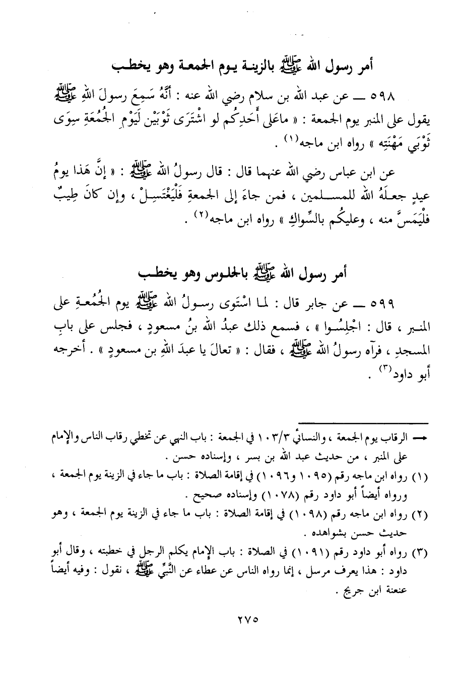 598 - عن عبد الله بن سلام رضي الله عنه: أنَّهُ سَمِعَ رسولَ اللهِ - صلى الله عليه وسلم - يقول على المنبر يوم الجمعة: "ما عَلى أَحَدِكُم لو اشْتَرَى ثَوْبَيْن لَيَوْمِ الجُمُعَةِ سِوَى ثَوْبَي مَهْنَتِه" رواه ابن ماجه (¬1).