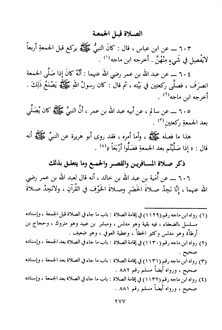 603 - عن ابن عباس، قال: كانَ النبيُّ - صلى الله عليه وسلم - يركع قبل الجمعةِ أربعًا لا يَفْصِل في شَيءٍ مِنْهُنَّ. أخرجه ابن ماجه (¬1).