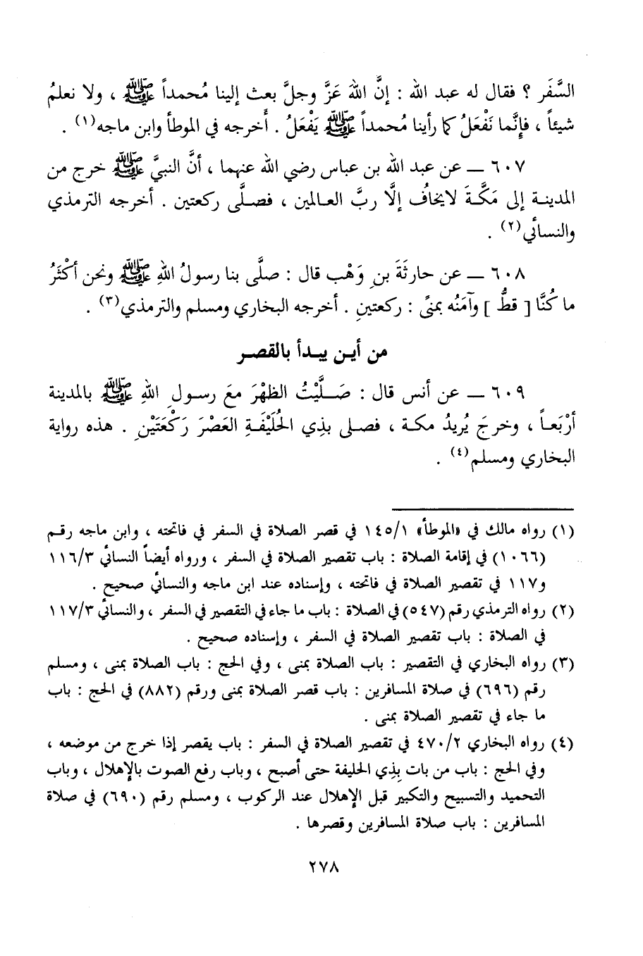 609 - عن أنس قال: صَلَّيْتُ الظهْرَ معَ رسولِ اللهِ - صلى الله عليه وسلم - بالمدينة أرْبَعًا، وخرجَ يُريدُ مكة، فصلى بذِي الحُلَيْفَةِ العَصْرَ رَكْعَتَيْنِ. هذه رواية البخاري ومسلم (¬4).
