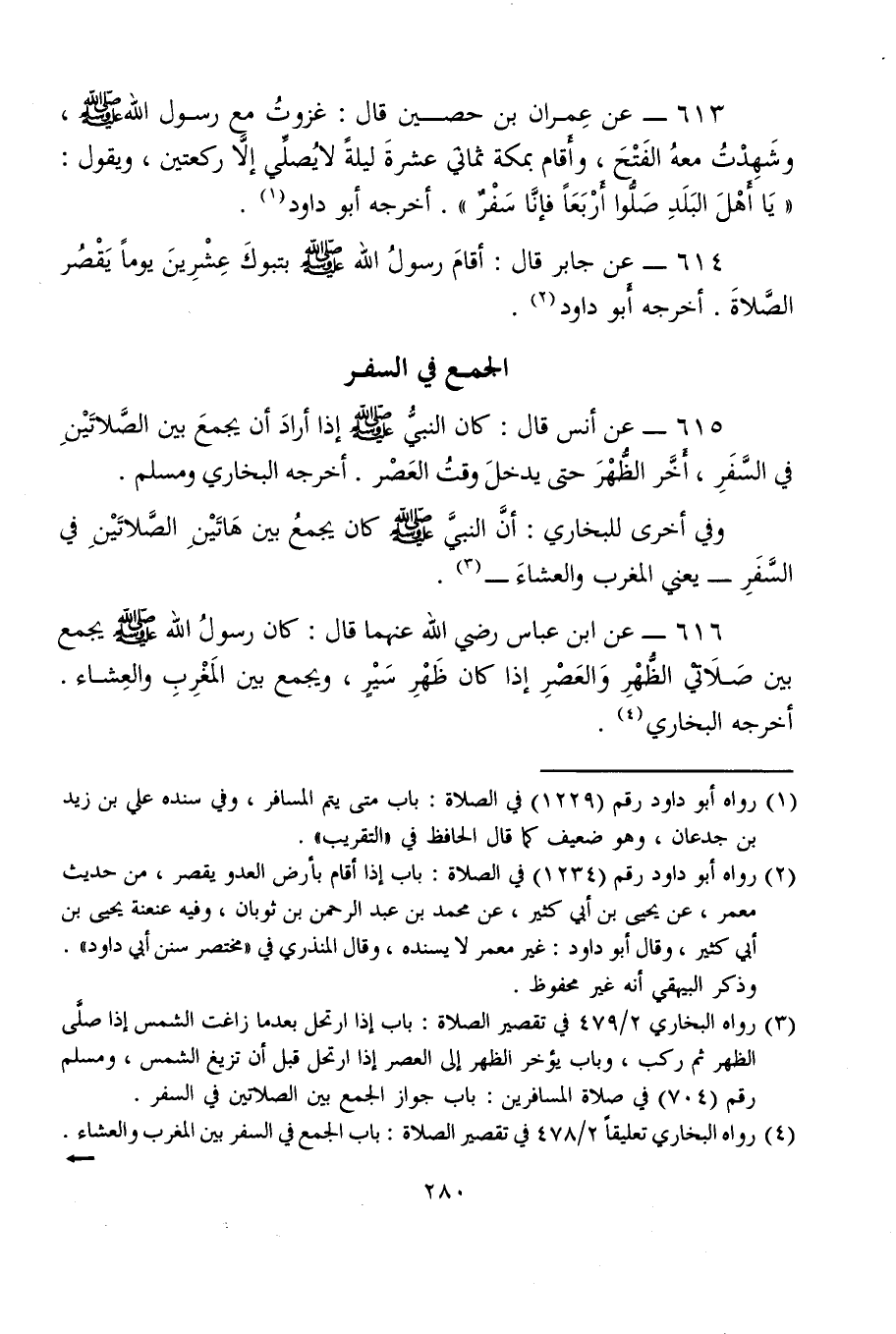614 - عن جابر قال: أقامَ رسولُ الله - صلى الله عليه وسلم - بتبوكَ عِشْرِينَ يومًا يَقْصُر الصَّلاةَ. أخرجه أبو داود (¬2).