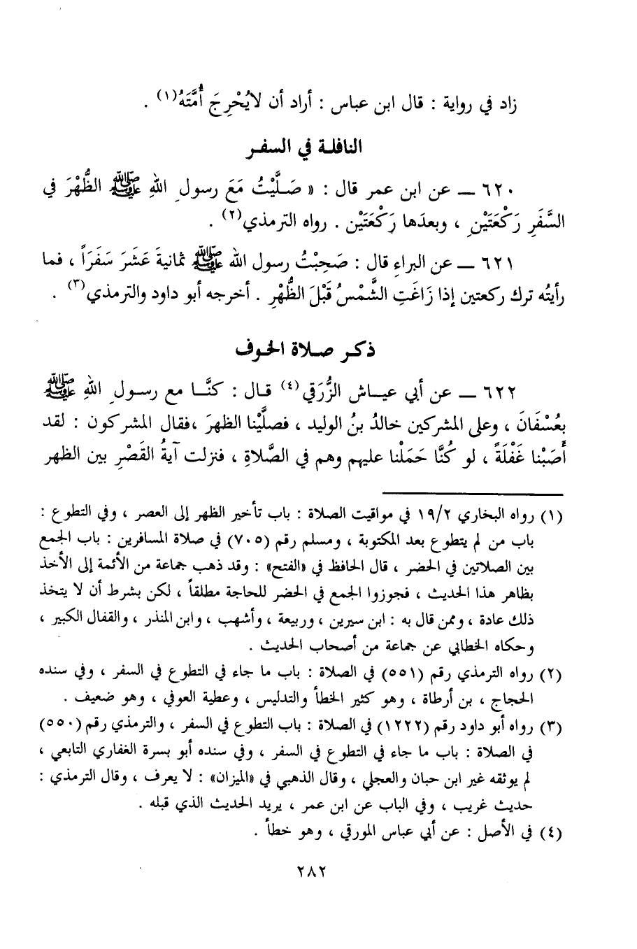 620 - عن ابن عمر قال: "صَلَّيْتُ مَعَ رسولِ اللهِ - صلى الله عليه وسلم - الظُّهْرَ في السَّفَرِ رَكْعَتَيْنِ، وبعدَها رَكْعَتَيْن. رواه الترمذي (¬2).