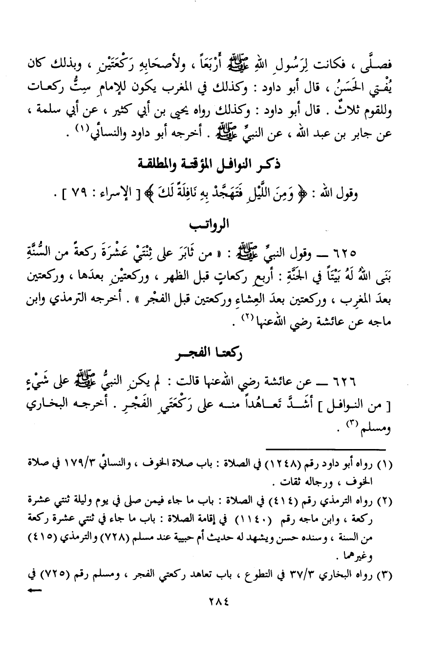 626 - عن عائشة رضي الله عنها قالت: لم يكنِ النبيُّ - صلى الله عليه وسلم - على شَيْءٍ [من النوافل] أشَدَّ تَعاهُدًا منه على رَكْعَتَيِ الفَجْرِ. أخرجه البخاري ومسلم (¬3).