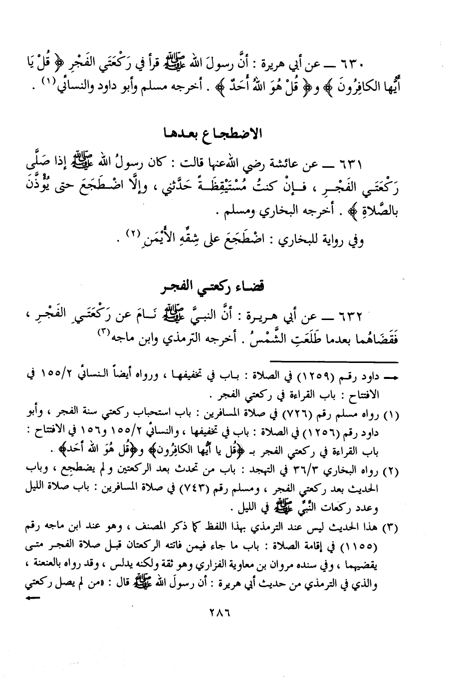 632 - عن أبي هريرة: أنَّ النبيَّ - صلى الله عليه وسلم - نَامَ عن رَكْعَتَيِ الفَجْرِ، فَقَضَاهُما بعد ما طَلَعَتِ الشَّمْسُ. أخرجه الترمذي وابن ماجه (¬3)