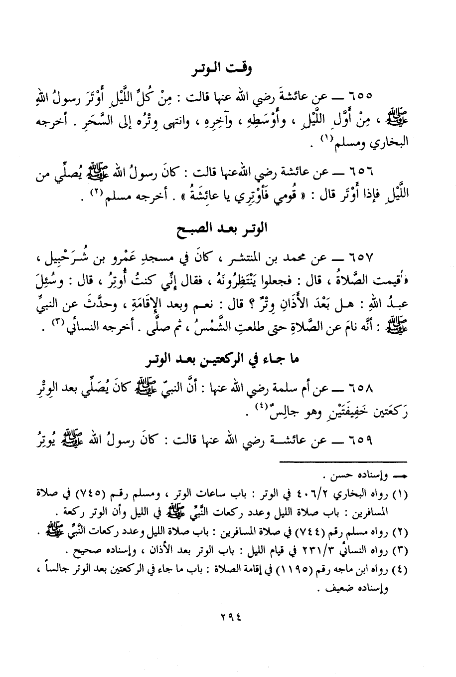 (¬1) رواه البخاري 2/ 406 في الوتر: باب ساعات الوتر، ومسلم رقم (745) في صلاة المسافرين: باب صلاة الليل وعدد ركعات النَّبيِّ - صلى الله عليه وسلم - في الليل وأن الوتر ركعة.