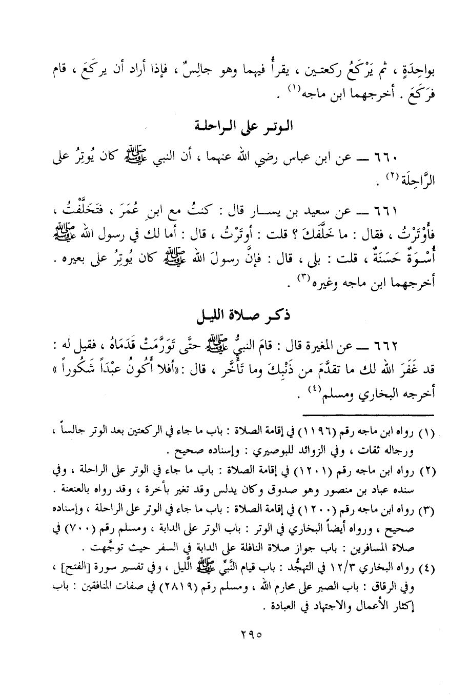 661 - عن سعيد بن يسار قال: كنتُ مع ابنِ عُمَرَ، فتَخَلَّفْتُ، فأَوْتَرْتُ، فقال: ما خَلَّفَكَ؟ قلت: أوتَرْتُ، قال: أما لك في رسول الله - صلى الله عليه وسلم - أُسْوَةٌ حَسَنَةٌ، قلت: بلى، قال: فإنَّ رسولَ الله - صلى الله عليه وسلم - كان يُوتِرُ على بعيره. أخرجهما ابن ماجه وغيره (¬3).