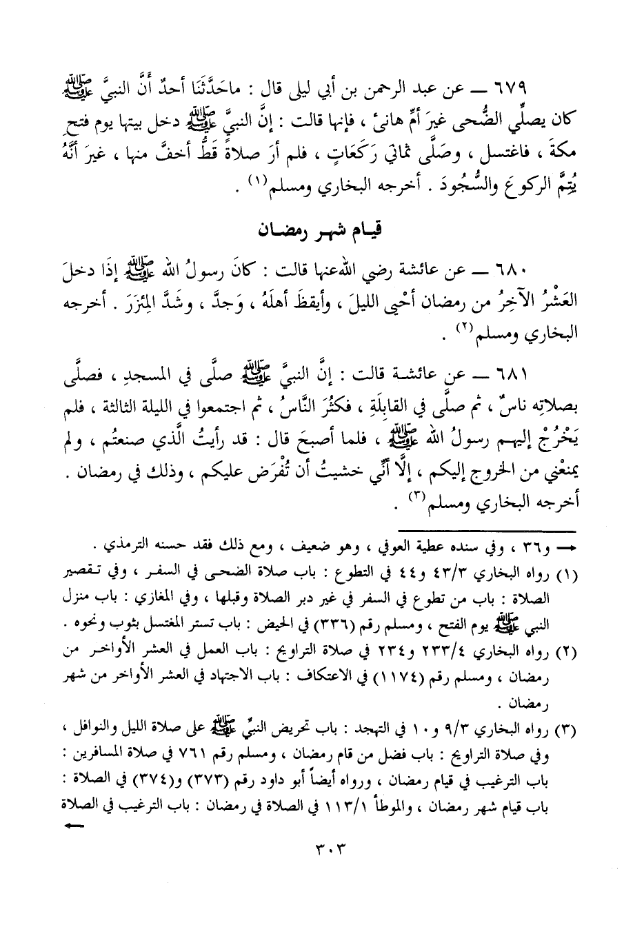 679 - عن عبد الرحمن بن أبي ليلى قال: ما حَدَّثَنَا أحدٌ أَنَّ النبيَّ - صلى الله عليه وسلم - كان يصلِّي الضُّحى غيرَ أمِّ هانئ، فإنها قالت: إنَّ النبيَّ - صلى الله عليه وسلم - دخل بيتها يوم فتحِ مكةَ، فاغتسل، وصَلَّى ثمانيَ رَكَعَاتٍ، فلم أرَ صلاةً قَطُّ أخفَّ منها، غيرَ أنَّهُ يُتِمَّ الركوعَ والسُّجُودَ. أخرجه البخاري ومسلم (¬1).