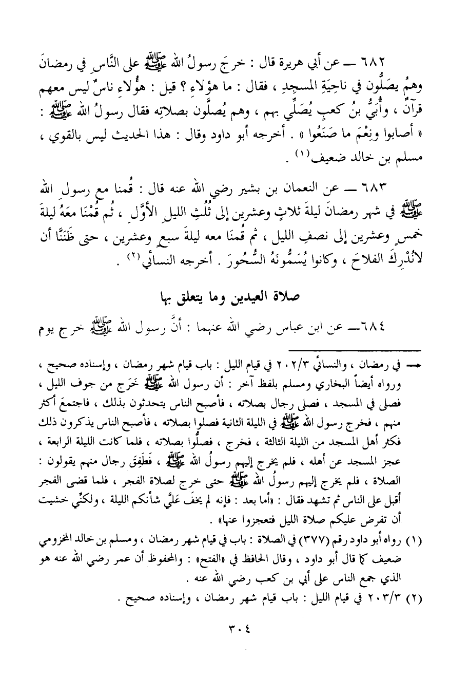 682 - عن أبي هريرة قال: خرج رسولُ الله - صلى الله عليه وسلم - على النَّاسِ في رمضانَ وهمُ يصَلُّون في ناحِيَةِ المسجِدِ، فقال: ما هؤلاءِ؟ قيل: هؤُلاءِ ناسٌ ليس معهم قرآنٌ، وأُبَيُّ بنُ كعبٍ يُصَلِّي بهم، وهم يُصلَّون بصلاتِه فقال رسولُ الله - صلى الله عليه وسلم -: "أصابوا ونِعْمَ ما صَنَعُوا". أخرجه أبو داود وقال: هذا الحديث ليس بالقوي، مسلم بن خالد ضعيف (¬1).