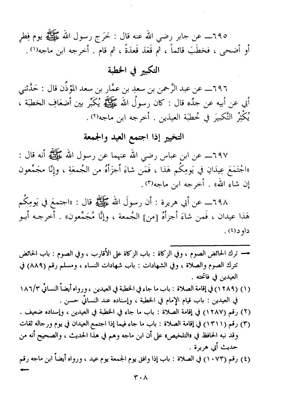 (¬3) رقم (1311) في إقامة الصلاة: باب ما جاء فيما إذا اجتمع العيدان في يوم ورجاله ثقات وقد نبه الحافظ في "التلخيص" على أن ابن ماجه وهم في هذا الحديث، والصحيح أنه من حديث أبي هريرة.