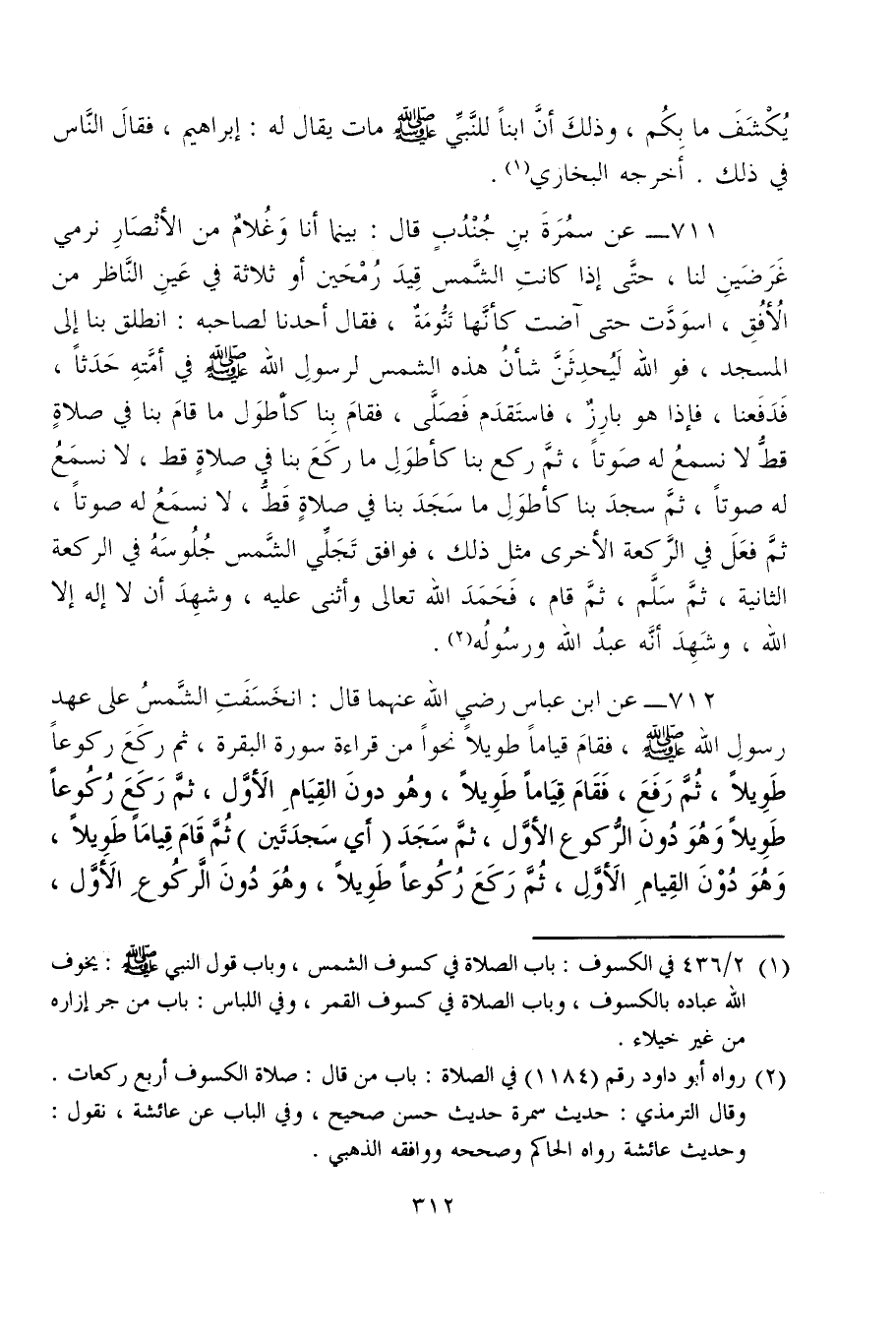 712 - عن ابن عباس رضي الله عنهما قال: انخَسَفَتِ الشَّمسُ على عهد رسولِ الله - صلى الله عليه وسلم -، فقامَ قيامًا طويلًا نحوًا من قراءة سورة البقرة، ثم ركَعَ ركوعًا طَوِيلًا، ثُمَّ رَفَعَ، فَقَامَ قِيَامًا طَوِيلًا، وهُو دونَ القِيَامِ الأَوَّل، ثمَّ رَكَعَ رُكُوعًا طَوِيلًا وَهُوَ دُونَ الرُّكوع الأوَّل، ثمَّ سَجَدَ (أَي سَجدَتَين) ثُمَّ قَامَ قِيامًا طَوِيلًا، وَهُوَ دُوْنَ القِيامِ الأَوَّلِ، ثُمَّ رَكَعَ رُكُوعًا طَوِيلًا، وهُوَ دُونَ الرُّكُوعِ الأَوَّل،