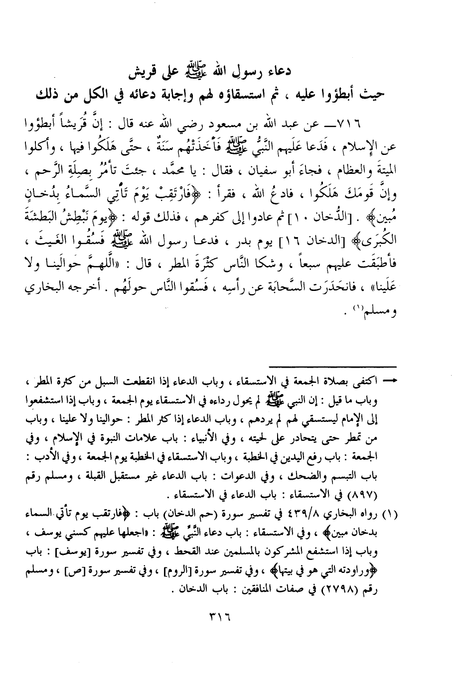 716 - عن عبد الله بن مسعود رضي الله عنه قال: إنَّ قُرَيشًا أبطؤوا عن الإِسلام، فَدَعا عَلَيهم النَّبيُّ - صلى الله عليه وسلم - فَأخَذَتْهُم سَنَةٌ، حتَّى هَلَكُوا فيها، وأكلوا الميتةَ والعظام، فجاءَ أبو سفيان، فقال: يا محمَّد، جئتَ تأمُرُ بِصِلَةِ الرَّحم، وإنَّ قَومَكَ هَلَكُوا، فادعُ الله، فقرأ: {فَارْتَقِبْ يَوْمَ تَأْتِي السَّمَاءُ بِدُخَانٍ مُبِينٍ} [الدخان: 10] ثم عادوا إلى كفرهم، فذلك قوله: {يَوْمَ نَبْطِشُ الْبَطْشَةَ الْكُبْرَى} [الدخان: 16] يوم بدر، فدعا رسول الله - صلى الله عليه وسلم - فَسُقُوا الغَيثَ، فأطبَقَت عليهم سبعًا، وشكا النَّاس كثْرَةَ المطر، قال: "الَّلهمَّ حوالَينا ولا عَلَينا"، فانحَدَرَت السَّحابَة عن رأسِه، فَسُقوا النَّاس حولَهُم. أخرجه البخاري ومسلم (¬1).