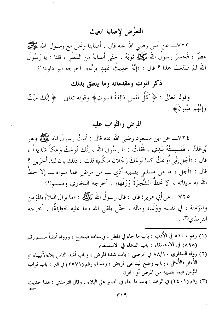 724 - عن ابن مسعود رضي الله عنه قال: أتيتُ رسولَ الله - صلى الله عليه وسلم - وهو يُوعَكُ، فَمَسِستُهُ بِيَدِي، فقُلتُ: يا رَسُولَ الله، إنَّك تُوعَكُ وَعكًا شَديدًا، قال: "أجَل إنِّي أُوعَكُ كَما يُوعَكُ رَجُلان منكُم" قلت: ذلك بأن لك أجرَين؟ قال: "أجل، ما من مسلمٍ يصيبه أذى - من مرضٍ فما سواه - إلا حطَّ الله به سيئاته، كما تحطُّ الشَّجرَةُ وَرَقَها". أخرجه البخاري ومسلم (¬2).