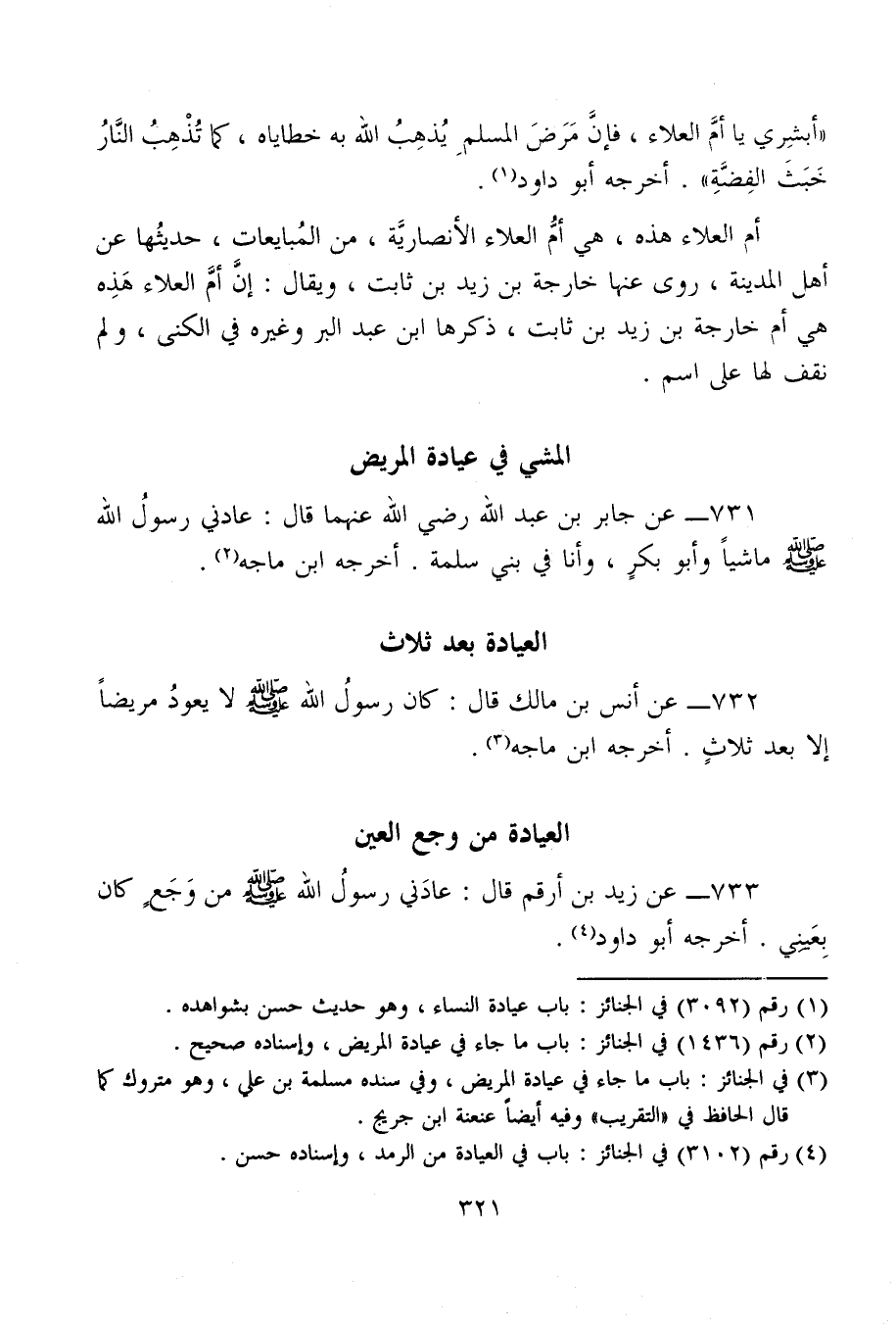 733 - عن زيد بن أرقم قال: عادَني رسولُ الله - صلى الله عليه وسلم - من وَجَعٍ كان بِعَينِي. أخرجه أبو داود (¬4).