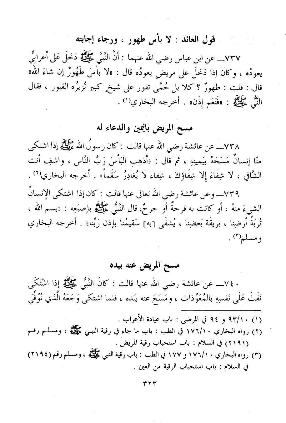 738 - عن عائشة رضي الله عنها قالت: كان رسولُ الله - صلى الله عليه وسلم - إذا اشتكى منّا إنسانٌ مَسَحَهُ بيَمينِهِ، ثم قال: "أَذهِبِ البَأسَ رَبَّ النَّاس، واشفِ أنت الشَّافي، لا شِفَاءَ إِلا شِفَاؤكَ، شِفاء لا يُغادِرُ سَقَمًا". أخرجه البخاري (¬2).