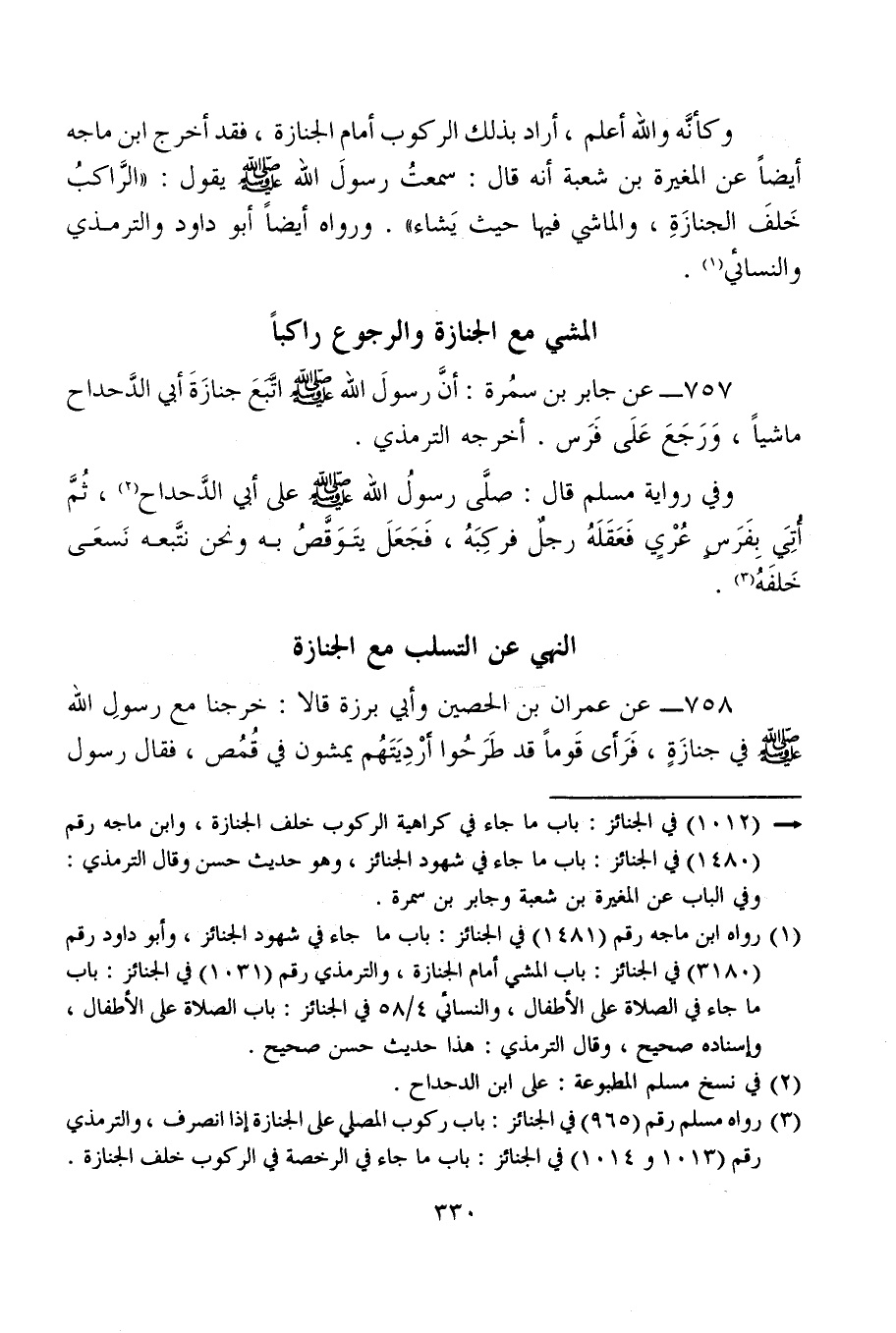 (¬3) رواه مسلم رقم (965) في الجنائز: باب ركوب المصلى على الجنازة إذا انصرف، والترمذي رقم (1013 و 1014) في الجنائز: باب ما جاء في الرخصة في الركوب خلف الجنازة.