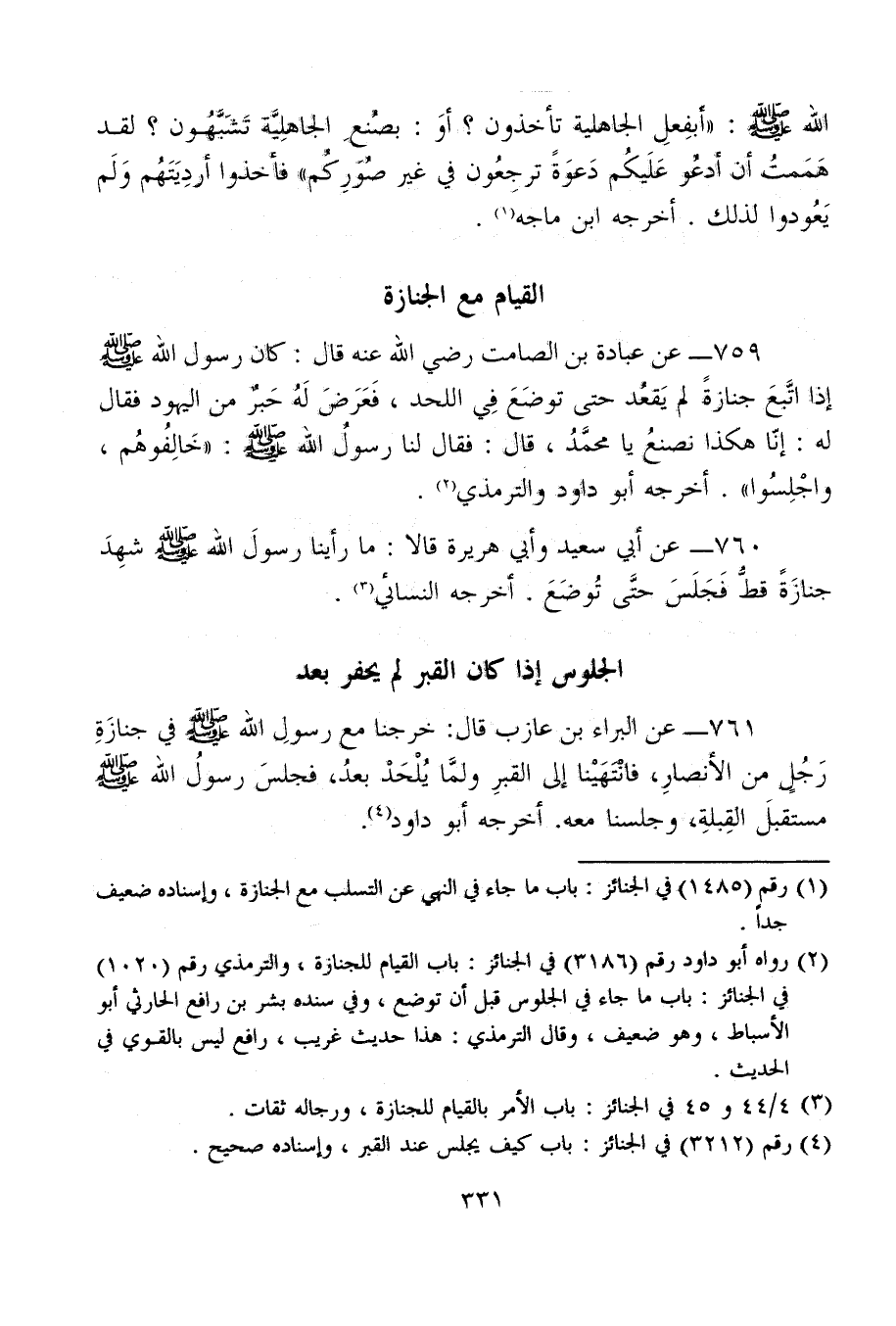 759 - عن عبادة بن الصامت رضي الله عنه قال: كان رسول الله - صلى الله عليه وسلم - إذا اتَّبعَ جنازةً لم يَقعُد حتى توضَعَ فِي اللحد، فَعَرَض لَهُ حَبرٌ من اليهود فقال له: إنّا هكذا نصنعُ يا محمَّدُ، قال: فقال لنا رسولُ الله - صلى الله عليه وسلم -: "خَالِفُوهُم، واجْلِسُوا". أخرجه أبو داود والترمذي (¬2).