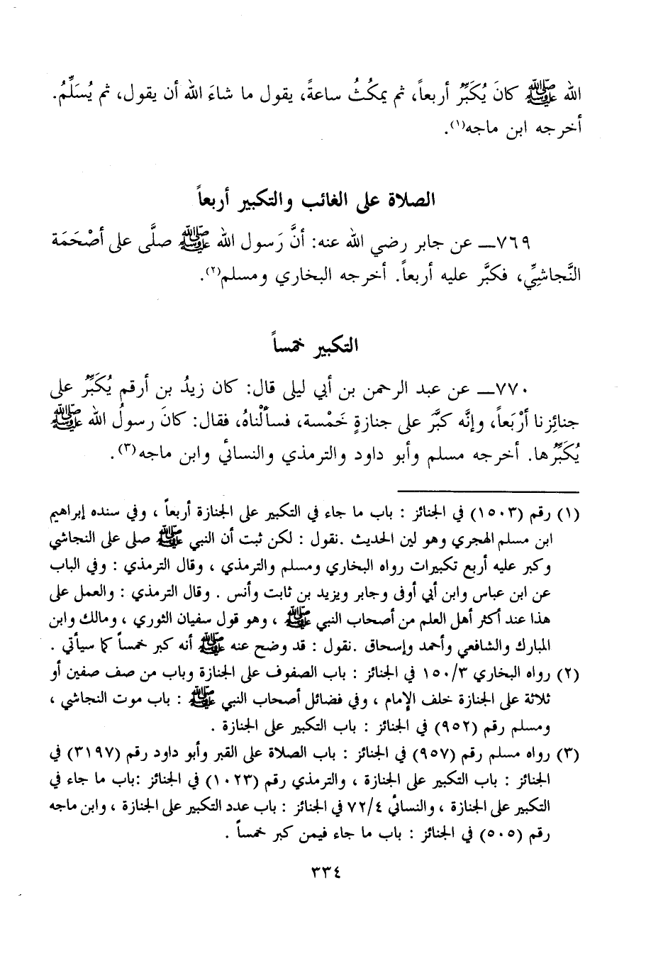 770 - عن عبد الرحمن بن أبي ليلى قال: كان زيدُ بن أرقم يُكَبِّرُ على جنائِزنا أَرْبَعًا، وإنَّه كبَّرَ على جنازةٍ خَمْسة، فسأَلْناهُ، فقال: كانَ رسولُ الله - صلى الله عليه وسلم - يُكَبِّرُها. أخرجه مسلم وأبو داود والترمذي والنسائي وابن ماجه (¬3).