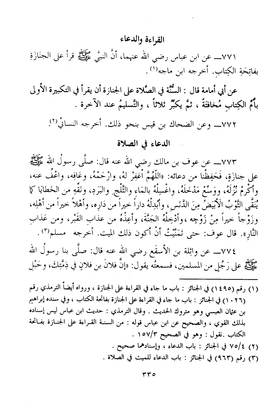 771 - عن ابن عباس رضي الله عنهما، أنَّ النبيَّ - صلى الله عليه وسلم - قرأ على الجنَازَةِ بفاتِحَةِ الكِتابِ. أخرجه ابن ماجه (¬1).