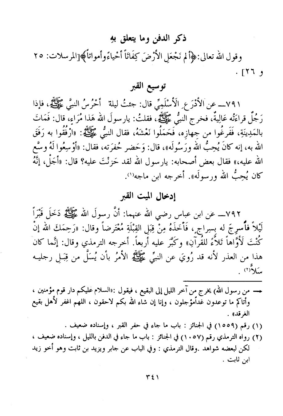 792 - عن ابن عباس رضي الله عنهما: أنَّ رسولَ الله - صلى الله عليه وسلم - دَخَلَ قَبْرًا لَيْلًا فأُسرِجَ له بِسِراجٍ، فَأخَذَهُ مِن قِبَلِ القِبْلَةِ مُعْتَرضًا وقال: "رَحِمَكَ الله إنْ كُنْتَ لَأوَّاهًا تَلَّاءً للقُرآنِ" وكَبَّرَ عليه أربعًا. أخرجه الترمذي وقال: إنَّما كان هذا من العذر لأنه قد رُويَ عن النبيِّ - صلى الله عليه وسلم - الأمرُ بأن يُسَلَّ من قِبَلِ رجليه سَلًّا (¬2).