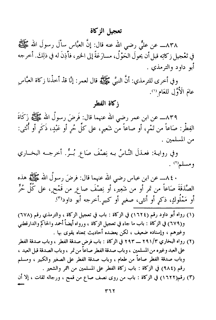 838 - عن عليٍّ رضي الله عنه قال: إنَّ العبَّاس سألَ رسولَ الله - صلى الله عليه وسلم - في تَعْجيل زكاتِه قبل أن يحولَ الحَوْلُ، مسارَعَةً إلى الخير، فأذِنَ له في ذلِكَ. أخرجه أبو داود والترمذي.
