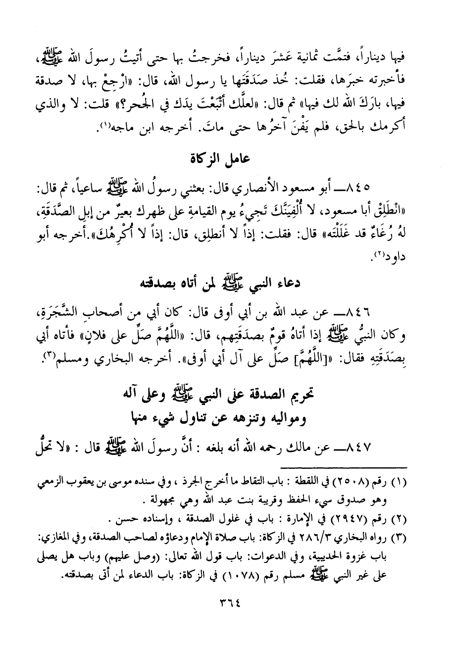 845 - أبو مسعود الأنصاري قال: بعثني رسولُ الله - صلى الله عليه وسلم - ساعيًا، ثم قال: "انْطَلِقْ أبا مسعود، لا أُلْفِيَنَّكَ تَجِيءُ يوم القيامةِ على ظهرك بعيرٌ من إبلِ الصَّدَقَةِ، لهُ رُغَاءٌ قد غَلَلْتَه" قال: فقلت: إذًا لا أنطلِق، قال: إذًا لا أُكْرِهُكَ". أخرجه أبو داود (¬2).