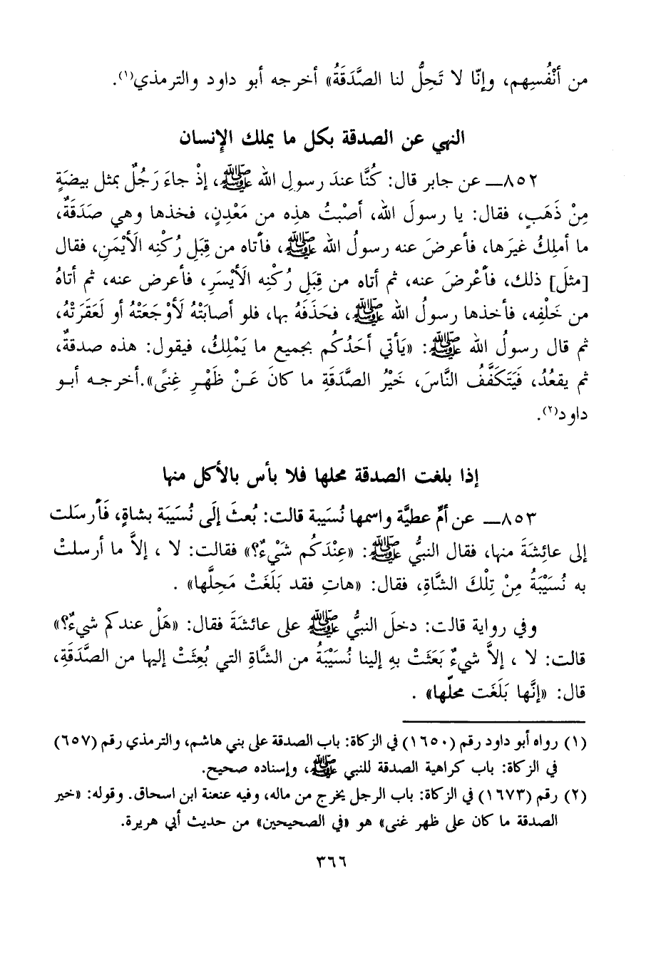 852 - عن جابر قال: كُنَّا عندَ رسولِ الله - صلى الله عليه وسلم -، إذْ جاءَ رَجُلٌ بمثل بيضَةٍ مِنْ ذَهَبٍ، فقال: يا رسولَ الله، أصْبتُ هذِه مِنْ مَعْدِنٍ، فخذها وهي صَدَقَةٌ، ما أملِكُ غيرَها، فأعرضَ عنه رسولُ الله - صلى الله عليه وسلم -، فأتاه من قِبَلِ رُكْنِه الأَيْمَنِ، فقال [مثلَ] ذلك، فأعْرضَ عنه، ثم أتاه من قِبَلِ رُكْنِه الأَيْسَرِ، فأعرض عنه، ثم أتاهُ من خَلْفِه، فأخذها رسولُ الله - صلى الله عليه وسلم -، فحَذَفَهُ بها، فلو أصابَتْهُ لأَوْجَعَتْهُ أو لَعَقَرَتْهُ، ثم قال رسولُ الله - صلى الله عليه وسلم -: "يَأتِي أحَدُكُم بجميع ما يَمْلِكُ، فيقول: هذه صدقةٌ، ثم يقعُدُ، فَيَتَكَفَّفُ النَّاسَ، خَيْرُ الصَّدَقَةِ ما كانَ عَنْ ظَهْرِ غِنىً". أخرجه أبو داود (¬2).