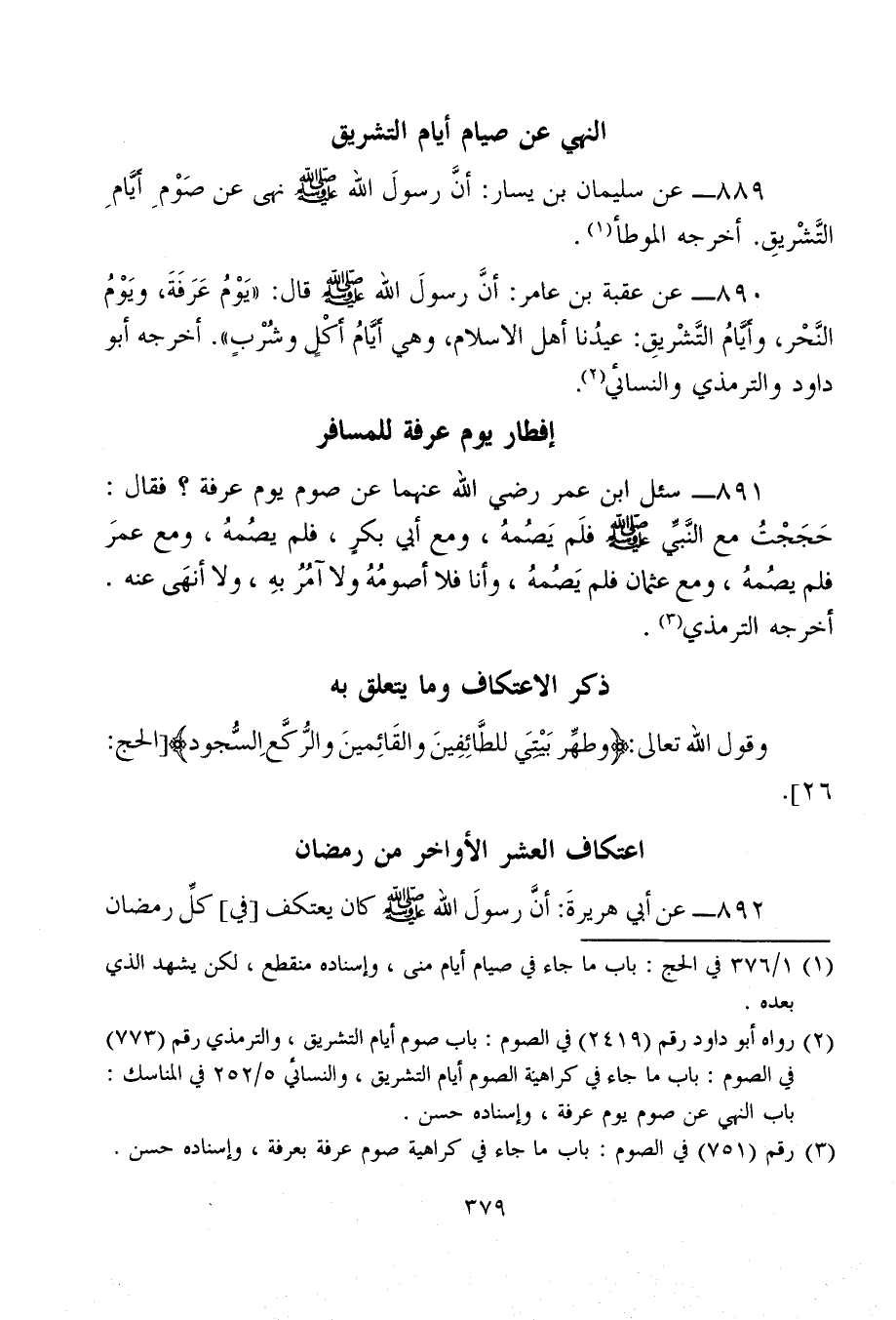 890 - عن عقبة بن عامر: أنَّ رسولَ الله - صلى الله عليه وسلم - قال: "يَوْمُ عَرَفَةَ، ويَوْمُ النَّحْر، وأَيَّامُ التَّشْريقِ: عيدُنا أهل الإِسلام، وهي أَيَّامُ أكْلٍ وشُرْبٍ". أخرجه أبو داود والترمذي والنسائي (¬2).