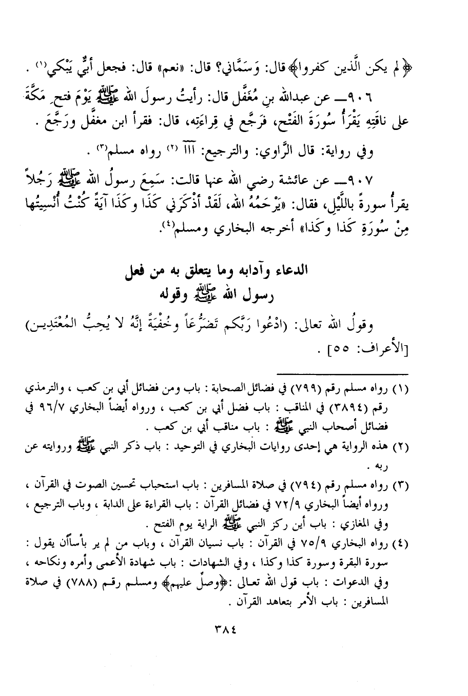 (¬4) رواه البخاري 9/ 75 في القرآن: باب نسيان القرآن، وباب من لم ير بأسًا أن يقول: سورة البقرة وسورة كذا وكذا، وفي الشهادات: باب شهادة الأعمى وأمره ونكاحه، وفي الدعوات: باب قول الله تعالى: {وَصَلِّ عَلَيْهِمْ} ومسلم رقم (788) في صلاة المسافرين: باب الأمر بتعاهد القرآن.