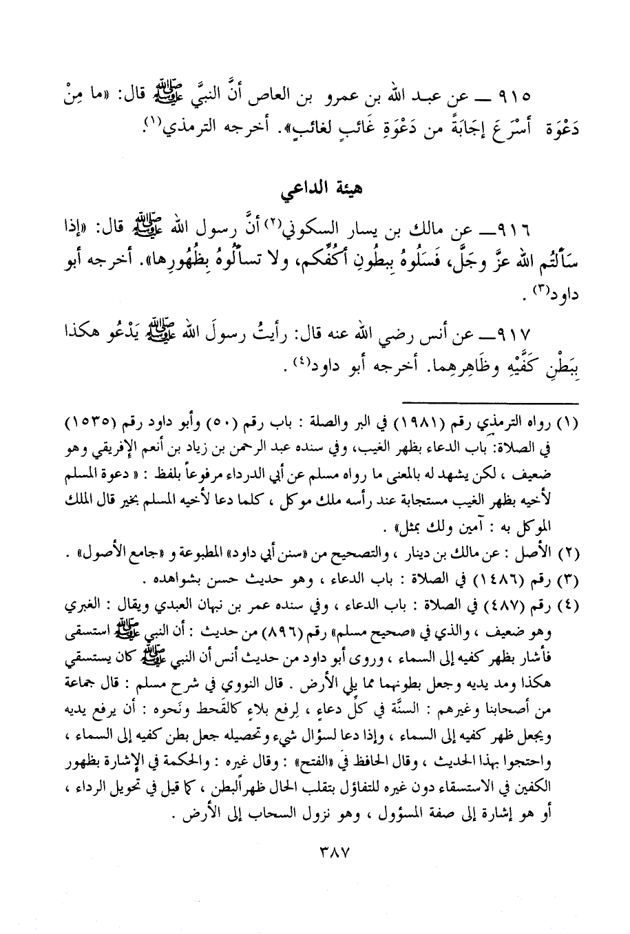917 - عن أنس رضي الله عنه قال: رأيتُ رسولَ الله - صلى الله عليه وسلم - يَدْعُو هكذا بِبَطْنِ كَفَّيْهِ وظَاهِرهِما. أخرجه أبو داود (¬4).