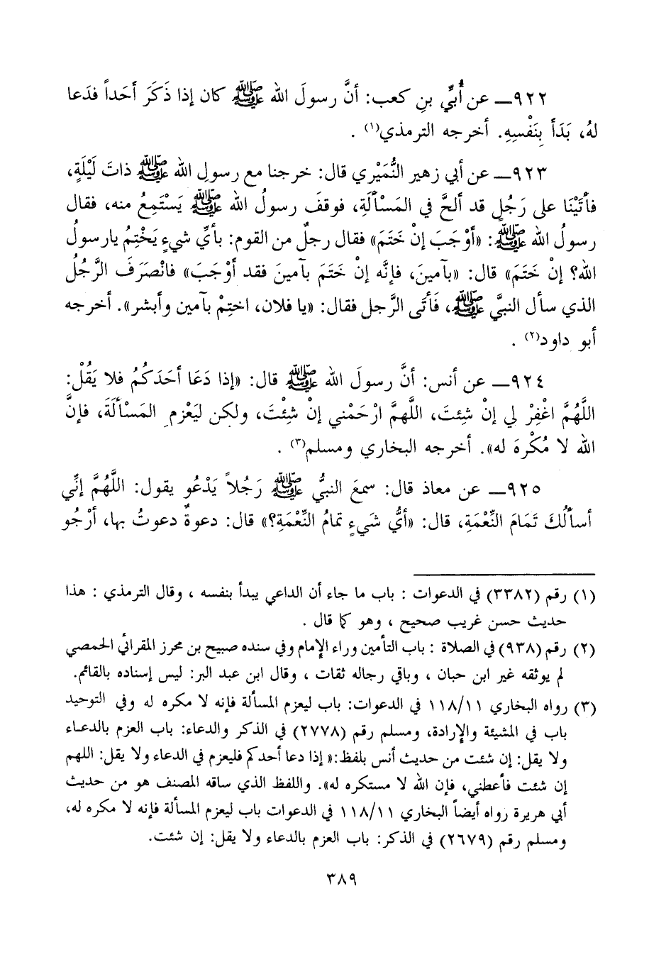 925 - عن معاذ قال: سمعَ النبيُّ - صلى الله عليه وسلم - رَجُلًا يَدْعُو يقول: اللَّهُمَّ إنِّي أسأَلُكَ تَمَامَ النِّعْمَةِ، قال: "أيُّ شَيءٍ تمامُ النِّعْمَةِ؟ " قال: دعوةٌ دعوتُ بها، أرْجُو