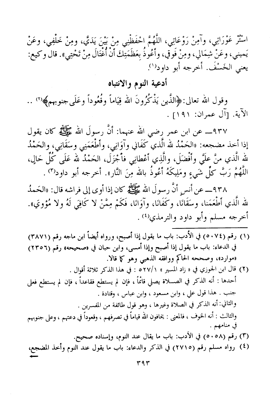 937 - عن ابن عمر رضي الله عنهما: أنَّ رسولَ الله - صلى الله عليه وسلم - كان يقول إذا أخذ مضجعه: "الحَمْدُ لله الَّذي كَفَانِي وآوَانِي، وأَطْعَمَنِي وسَقَانِي، والحَمْدُ لله الَّذي منَّ علَيَّ وأَفْضَلَ، والَّذِي أَعْطانِي فأجْزَلَ، الحَمْدُ لله عَلَى كُلِّ حَالٍ، اللَّهُمَّ رَبَّ كلِّ شَيءٍ ومَلِيكَهُ أعُوذُ بالله مِنَ النَّارِ". أخرجه أبو داود (¬3).