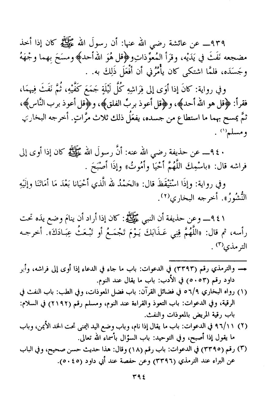 940 - عن حذيفة رضي الله عنه: أنَّ رسُولَ الله - صلى الله عليه وسلم - كان إذا أوى إلى فراشه قال: "باسْمِكَ اللَّهُمَّ أَحْيَا وأَمُوتُ" وإذَا أَصْبَحَ.
